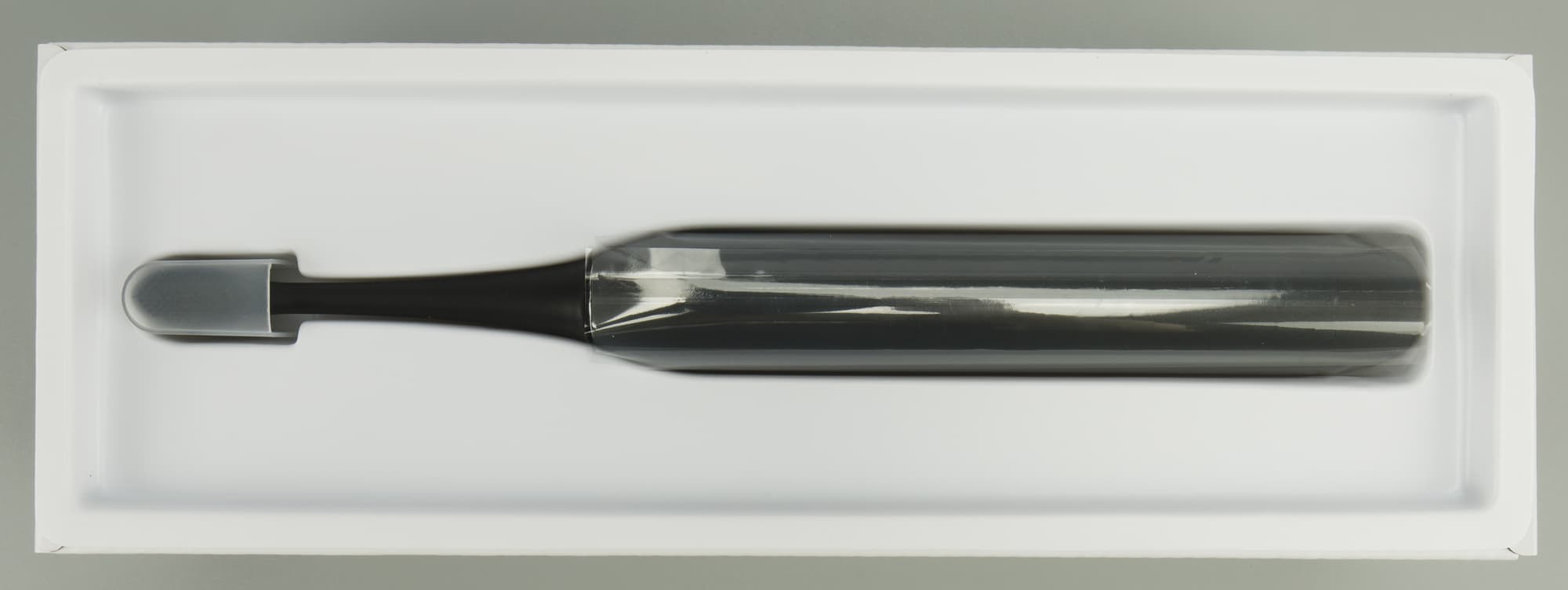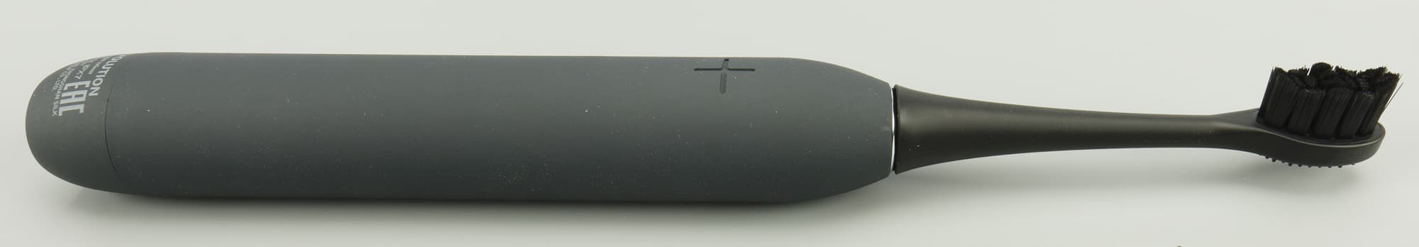 Корпус зубной щетки узнаваемой продолговатой цилиндрической формы выполнен из специфического, шершавого, противоскользящего материала. Весь силовой блок не больше средней восковой свечи, официально черного, а визуально скорее темно-серого цвета. Всё лаконично и аккуратно, отлично ложится в ладонь, комфортно в управлении, а главное почти невесомо. На дно нанесен логотип бренда, а внизу мы найдем краткое описание.