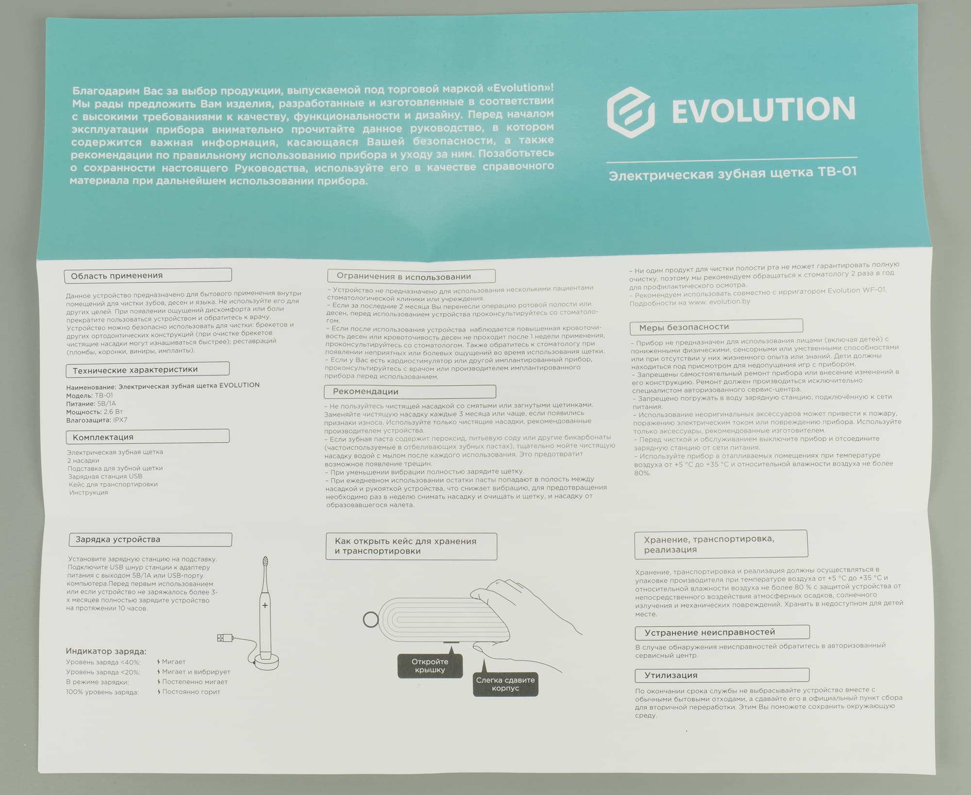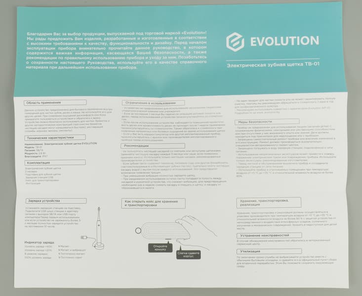 Фактически, это буклет из одного листа плотной матовой глянцевой бумаги формата А4, сложенной под ширину упаковки в три раз. Выполнена она в двух цветах: белом и бирюзовом, и содержит всю необходимую пользователю информацию: область применения прибора, ограничения, технические характеристики, описание работы зарядки со схемой, рекомендации, правила как открывать и хранить футляр, меры безопасности, описания режимов и способов очистки, а также адреса сервисных центров, условия гарантии и отметка о самой гарантии. Хранить инструкцию можно непосредственно в коробке или вместе с другими бумагами.