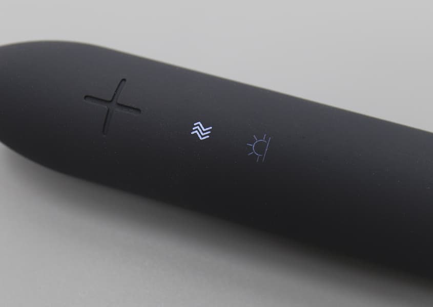 Единственное, что выделяется на корпусе — фактурная кнопка управления, похожая на крупный плюс. При кратковременном нажатии на него включается прибор, повторное нажатие переключит опции, значки которых будут подсвечены индикаторами.