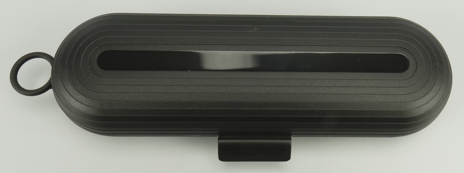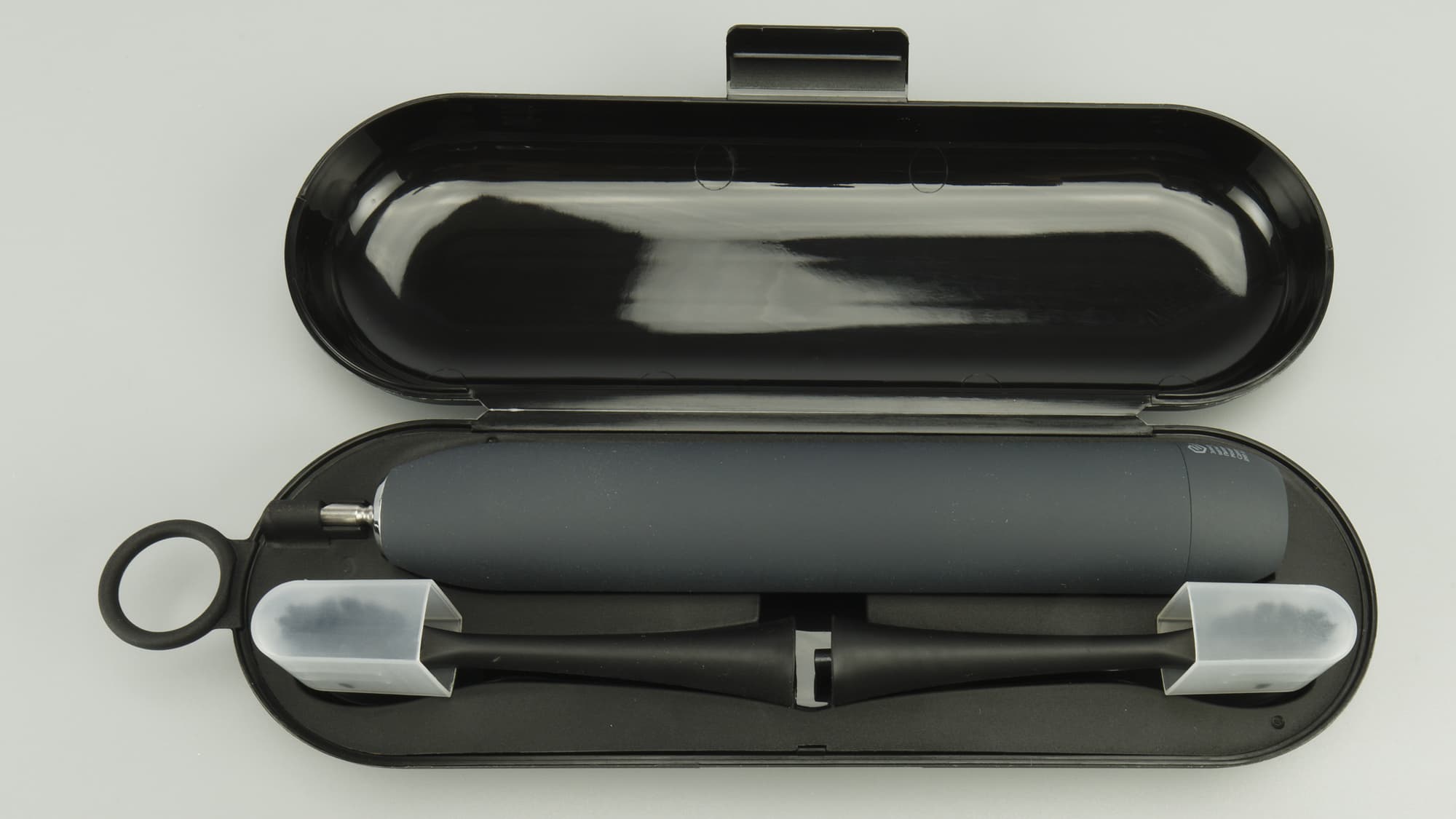 Черный чехол прибора выполнен из легкого, приятного пластика, внешне он напоминает удобный пенал. Внутри место для силового блока и двух съемных насадок. Закрывается кофр подвижной внешней защелкой, сбоку снабжен небольшим встроенным кольцом, видимо, в него можно продеть шнур и носить чехол на шее, например. Это удобно, когда ты дальней командировке где-то там, где умывальные места расположены не в индивидуальных номерах, а в общих коридорах или у водоемов.