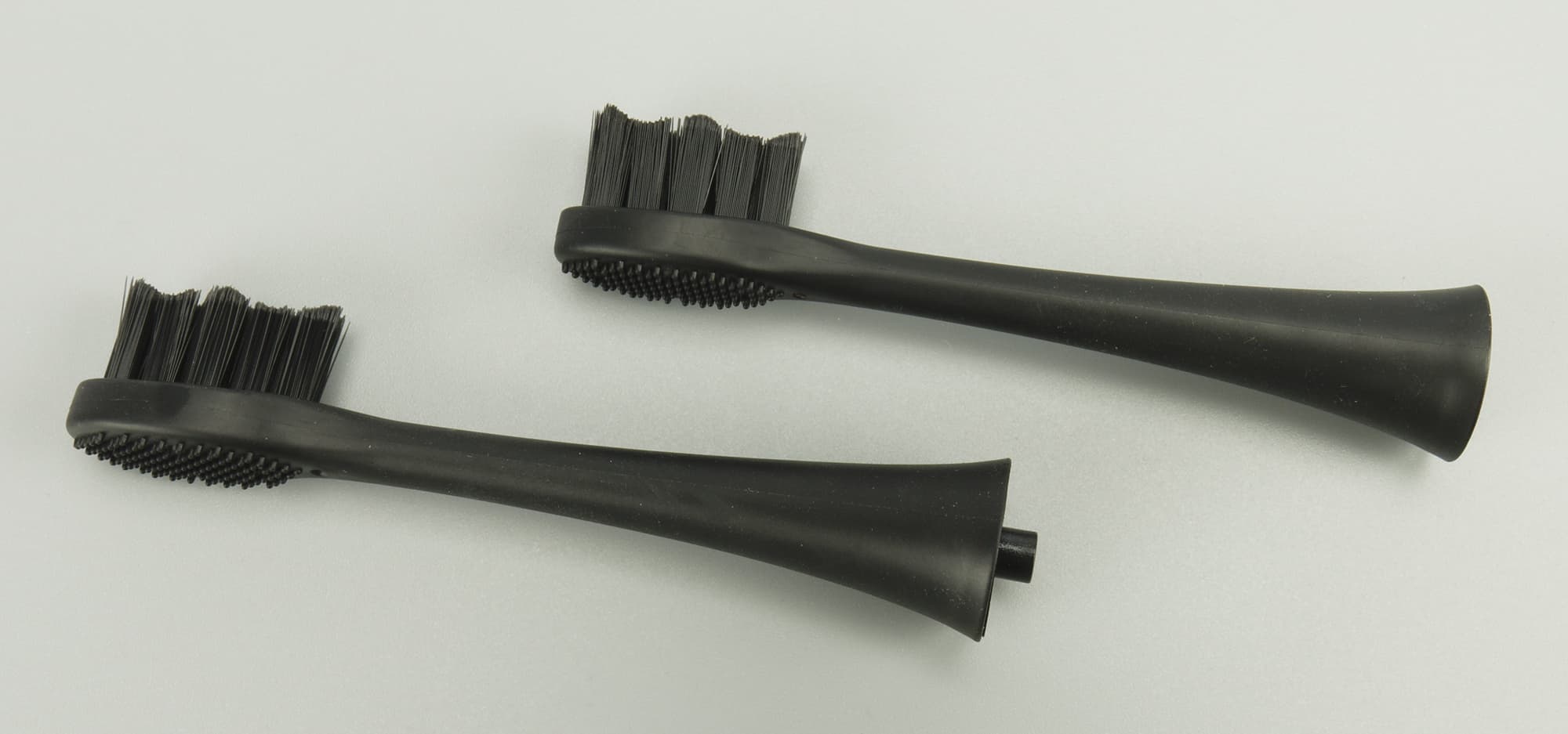 Щетина у насадки приятная на ощупь, черная в цвет всей насадки, с обратной стороны у нее шершавая поверхность, всего в комплекте две сменные универсальные насадки. Обе они снабжены защитными колпачками из белого пластика.