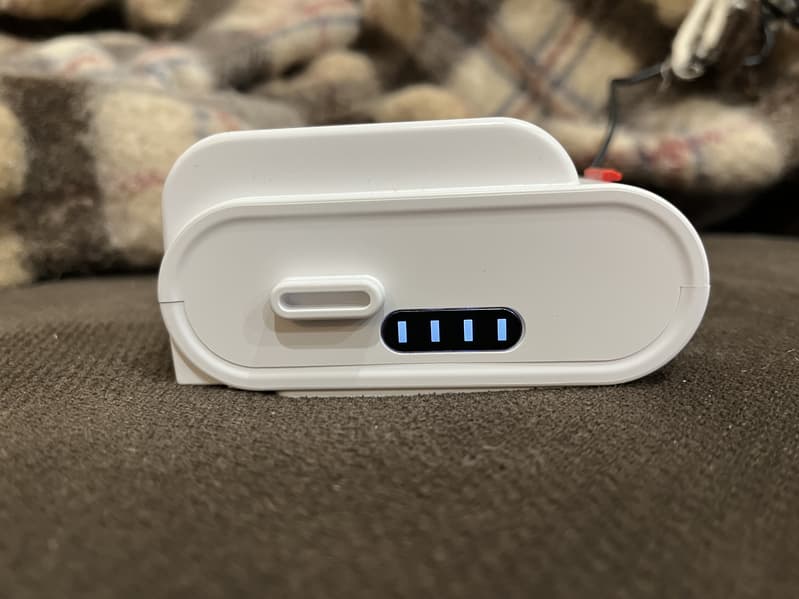 На аккумуляторе, снятом с корпуса прибора и поставленном на зарядку, мы видим индикатор с четырьмя делениями, которые поочередно мигают в процессе подзарядки, а постепенно «заполняясь», начинают гореть непрерывно. Это удобно, так как индикатор показывает хотя бы примерный уровень заряда на данный момент (без установки в корпус) и при необходимости можно снять аккумулятор с зарядки досрочно и воспользоваться им хотя бы для быстрой уборки.
