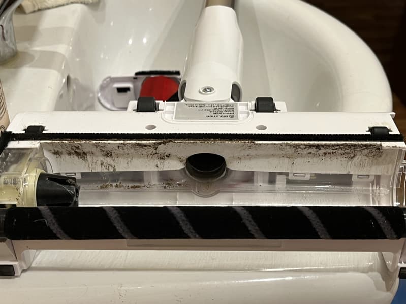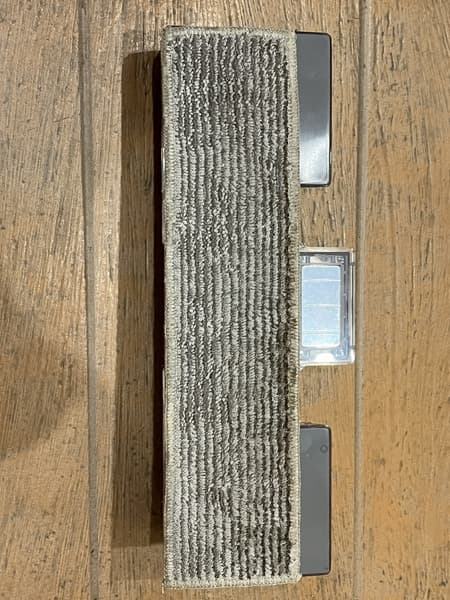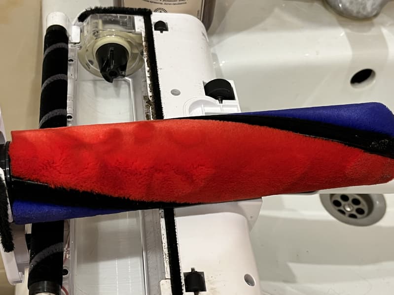 Использовав 50% заряда на сухую уборку, мы сменили валик на велюровый, набрали в специальный контейнер воду до отметки максимума и приступили к тестированию пылесоса при влажной уборке.