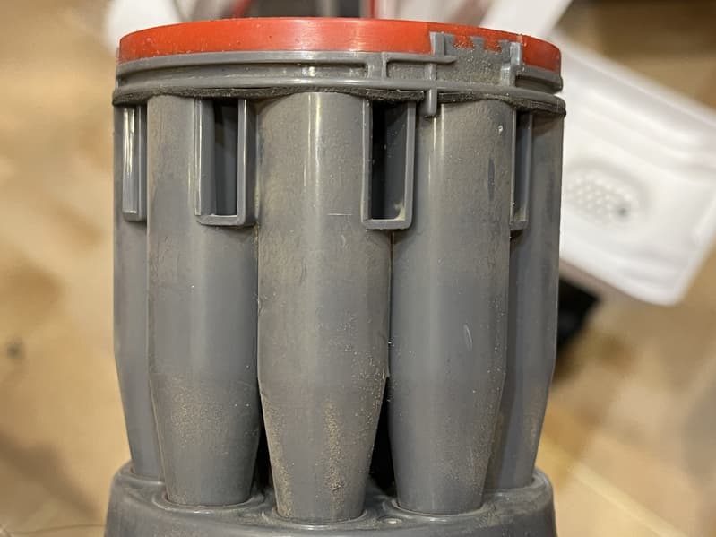 Внутри пылесборника находится съемный сотовый пластиковый фильтр, а вокруг него располагается несъемный сетчатый металлический фильтр.