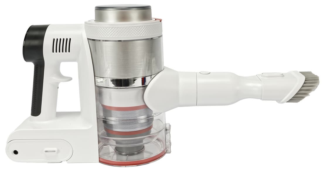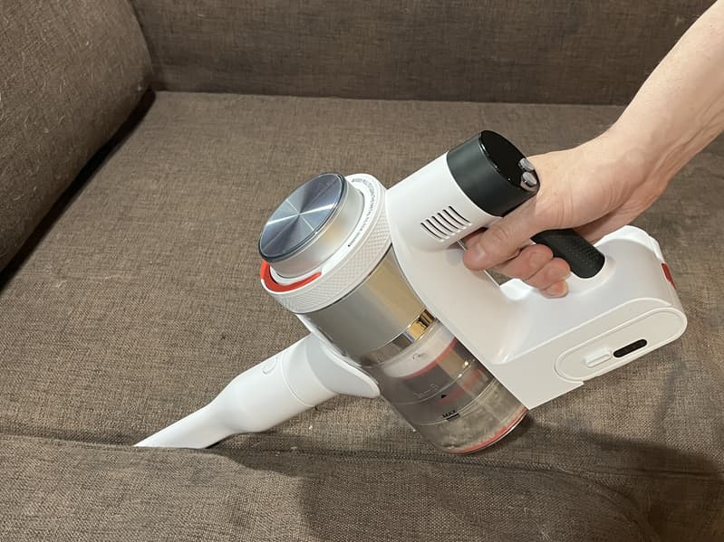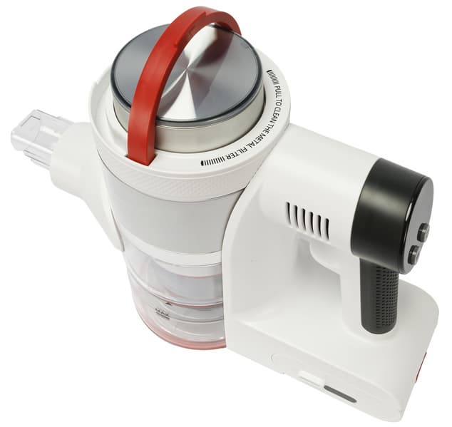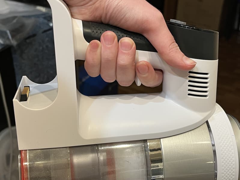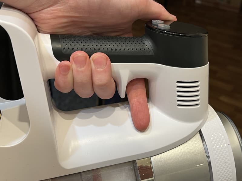 Собрав пылесос в конфигурации для классической уборки и воспользовавшись им непродолжительное время, мы сразу оценили удобную конструкцию ручки с разделителем для пальцев. Вес устройства в полной сборке получается ощутимым и благодаря этому разделителю устройство надежно зафиксировано ладонью и пальцами, а нагрузка распределяется равномерно на всю руку, что облегчает эксплуатацию.