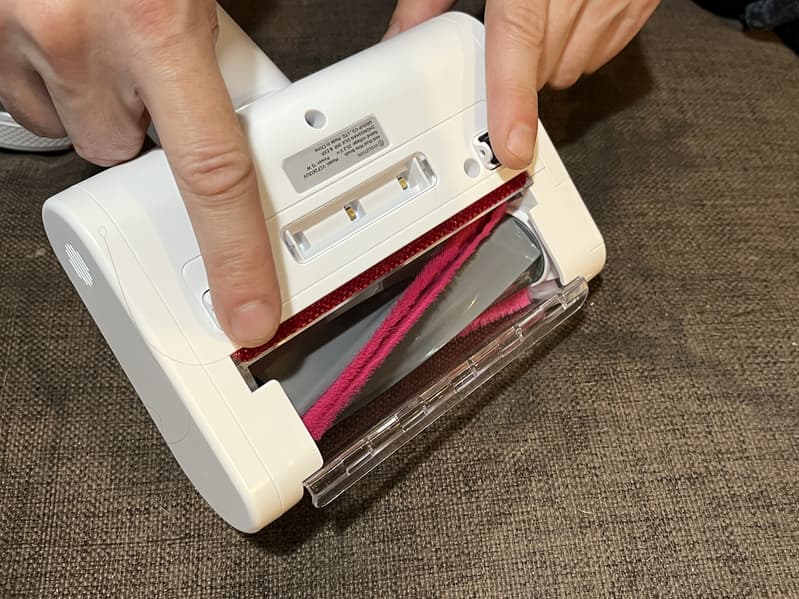 Также в насадку встроена система механического увлажнения — с помощью надавливания ногой на красную педаль, благодаря небольшому насосу под ней, происходит вывод воды через 5 небольших отверстий спрятанных под тканью на дне насадки.