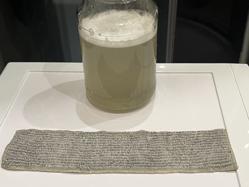 К моменту, когда пылесос разрядился, нам как раз почти удалось потратить всю воду из контейнера. Тряпка, как можно видеть на фото выше, при этом не выглядела сильно загрязненной. Поэтому чтобы выяснить, не слишком ли много грязи собирается на тряпке при непрерывном использовании всего контейнера с чистой водой, мы решили промыть ее с моющим средством в стеклянной банке и посмотреть на степень загрязнения воды.