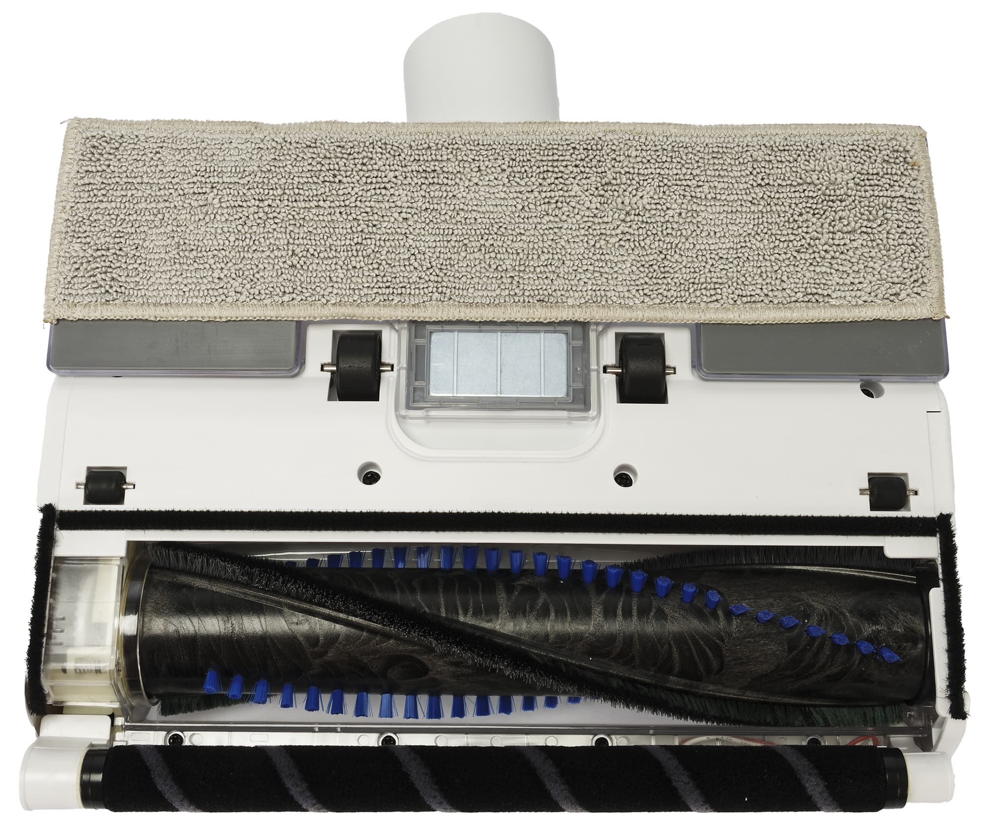 Насадка свободно движется по убираемой поверхности благодаря двум небольшим колесикам у основания. Между ними мы видим шильдик с краткой технической информацией.