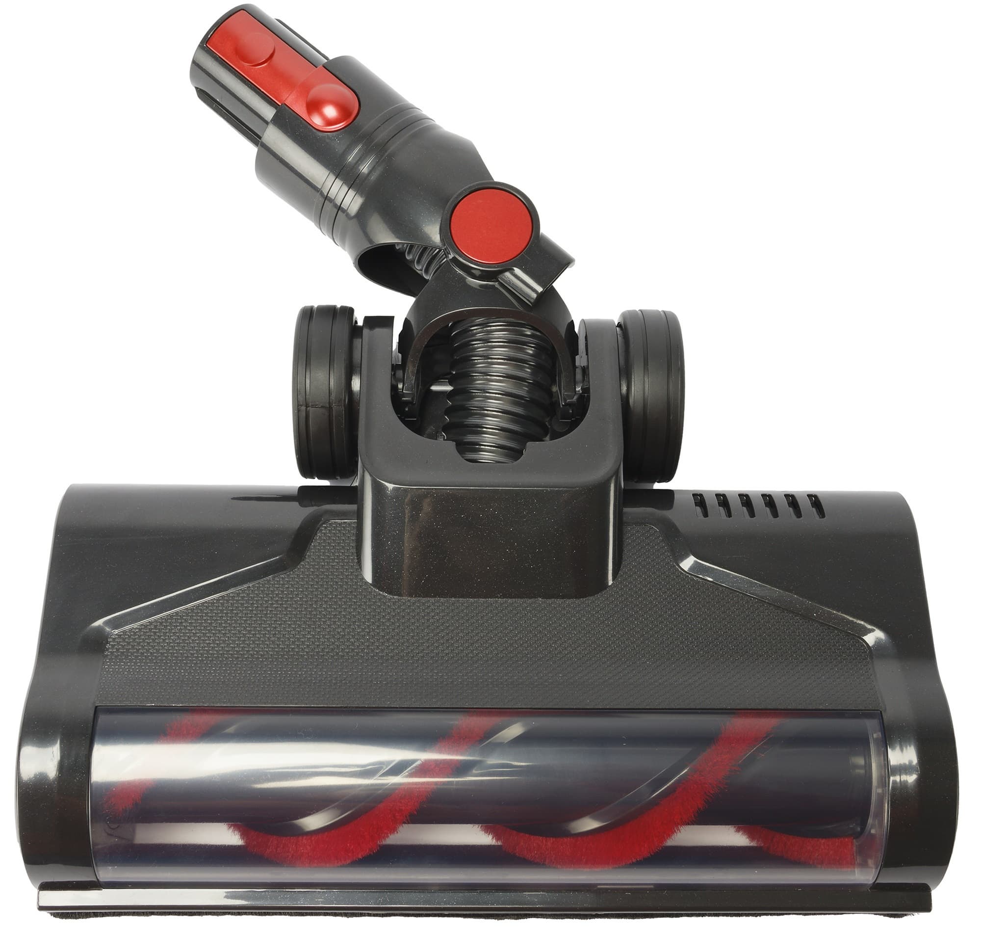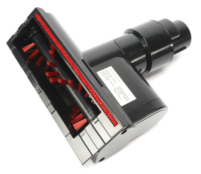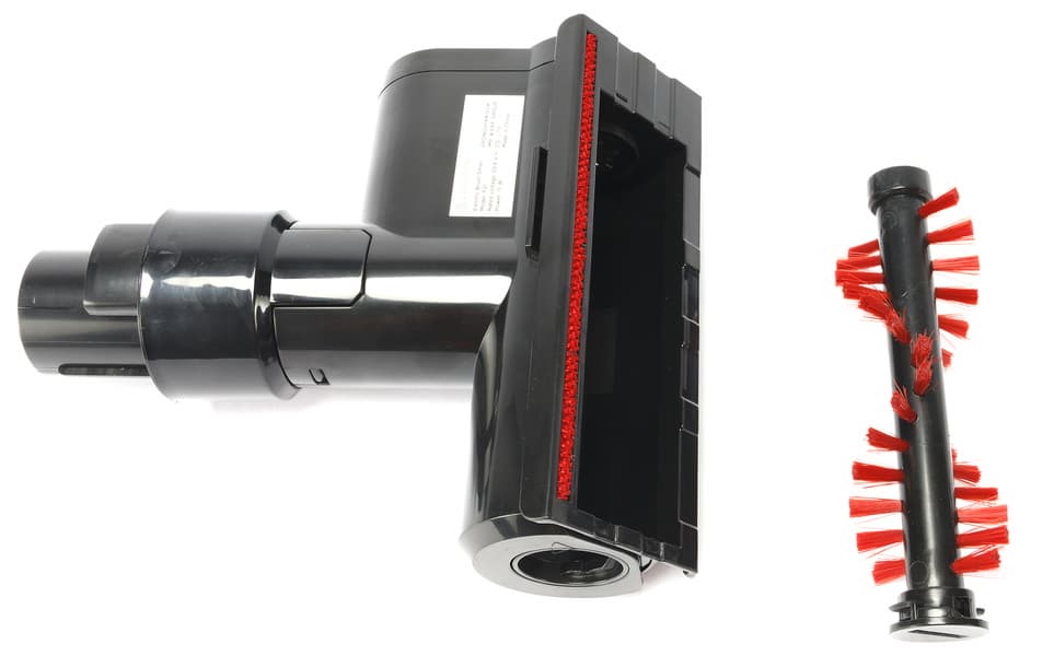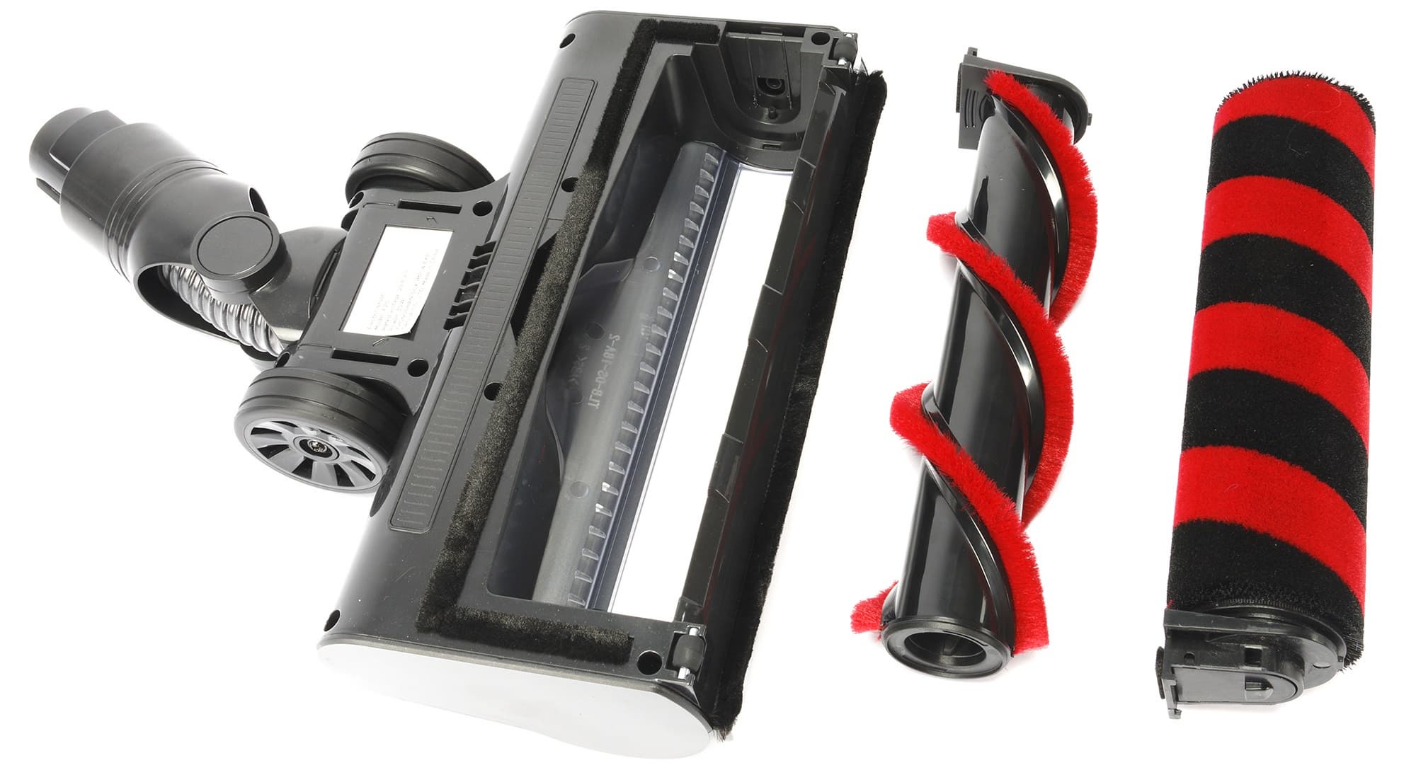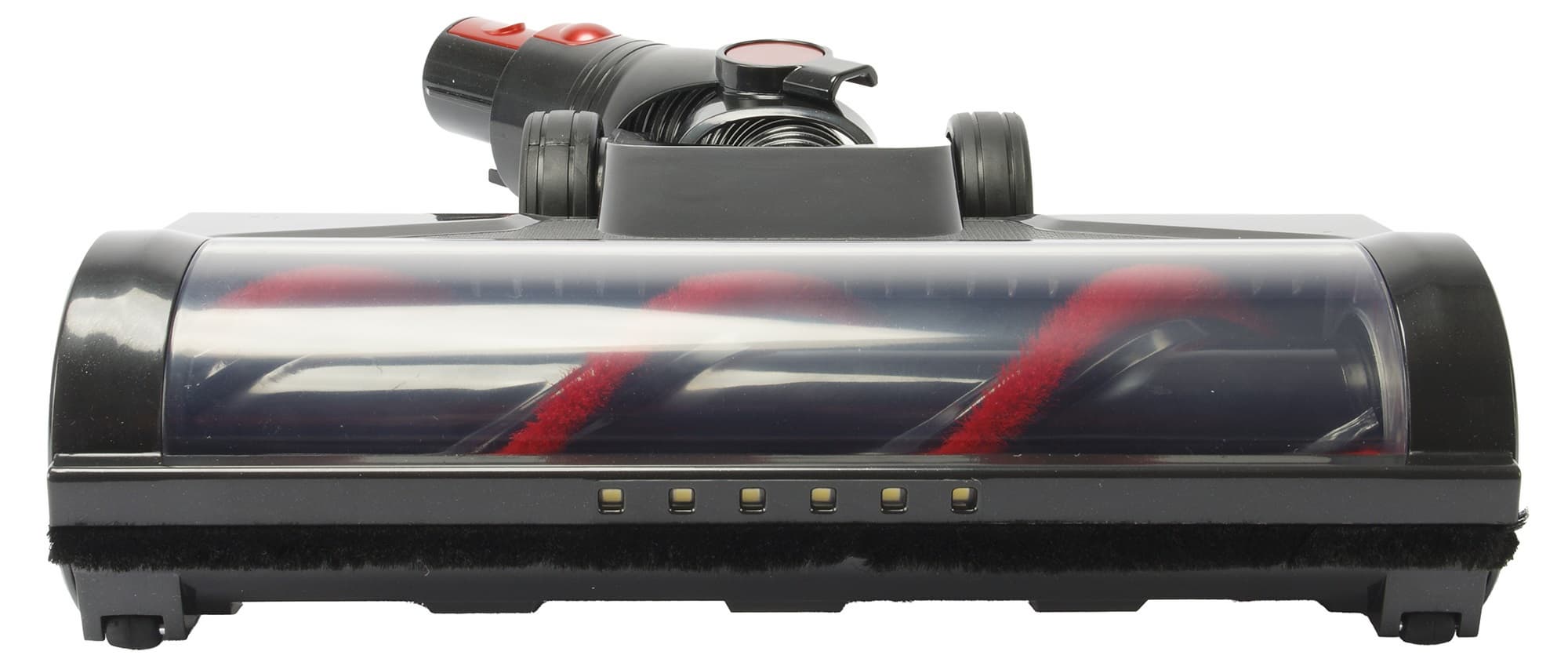 Щетка оснащена довольно яркой подсветкой, которая включается по умолчанию во время работы пылесоса. Вдоль всей поверхности щетки, которая прилегает к полу, имеется короткий велюровый ворс, он делает касание щетки к полу мягким и практически бесшумным. Полоска такого же ворса есть также и на передней панели щетки, поэтому она не царапается, касаясь мебели. Маленькие колесики по сторонам на конце щетки направляют ее движение, большие колеса покрыты резиновым материалом, хорошо сцепляются с очищаемой поверхностью и обеспечивают оптимальную высоту контакта щетки пылесоса с очищаемой поверхностью.