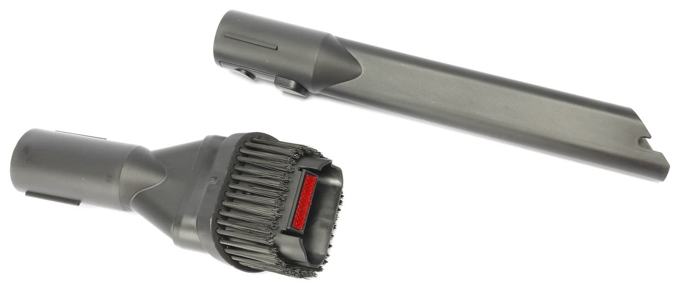 Две другие насадки, уже без электропривода, которые идут в комплекте к пылесосу, достаточно стандартные. Это щелевая насадка, с помощью которой можно добраться до узких, глубоко расположенных мест, чтобы собрать там пыль, а также насадка с для очистки мебели, которая за счет сдвигаемого венчика со щетиной может иметь два возможных положения.