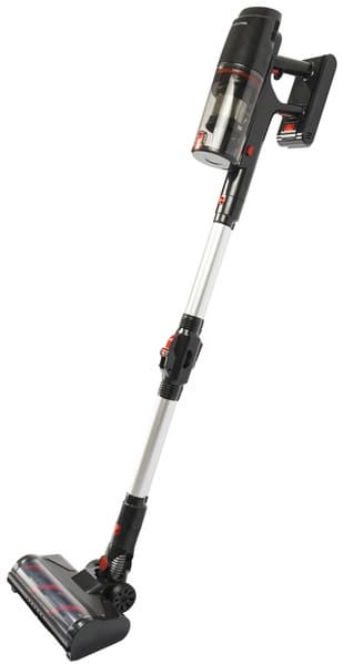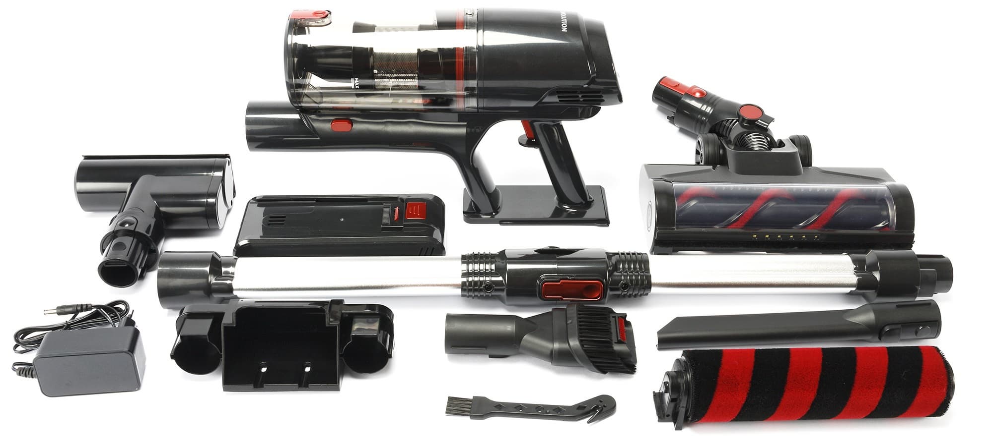 Беспроводной пылесос выглядит в целом привычным образом для вертикального аккумуляторного пылесоса. Он состоит из основного корпуса, или моторного блока, к которому крепятся аккумулятор и пылесборник. С помощью различных насадок, идущих в комплекте, он может быть собран в различных конфигурациях под разные задачи.