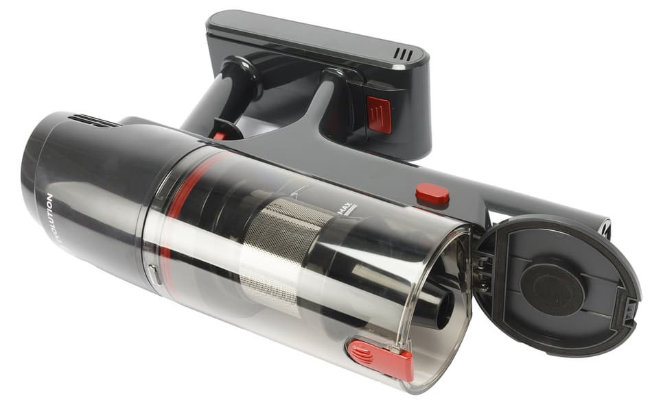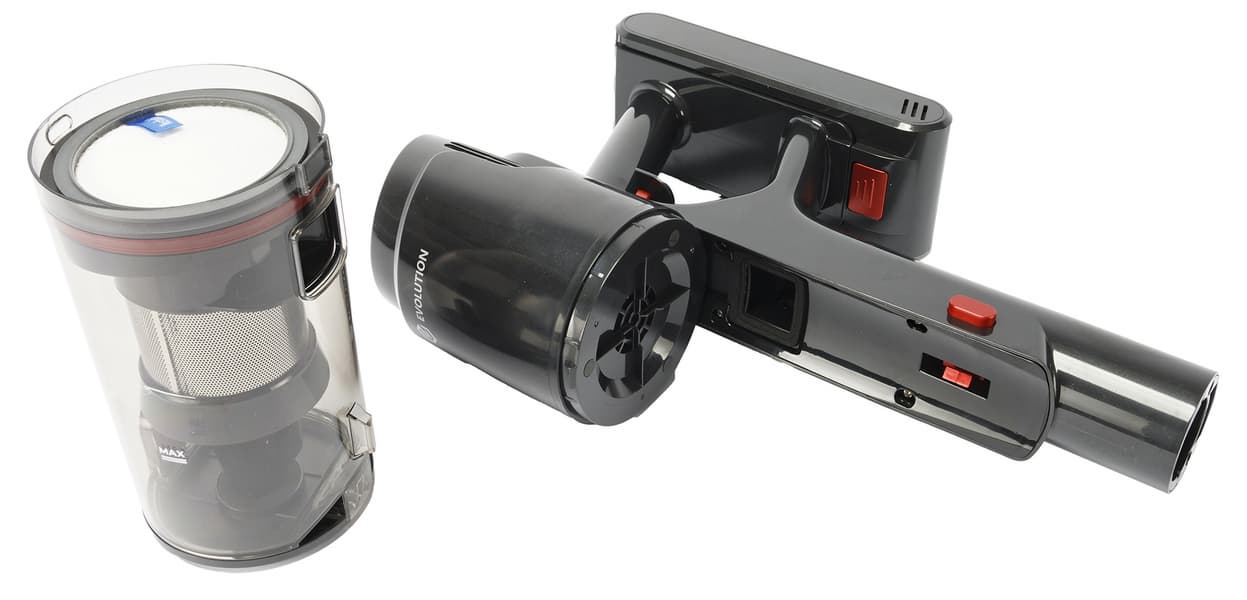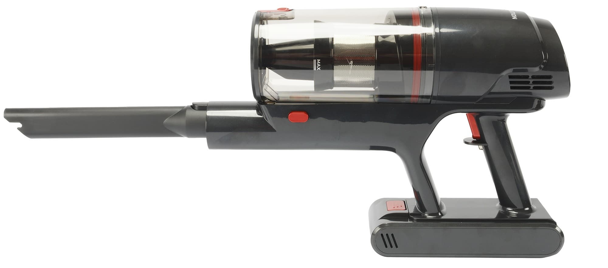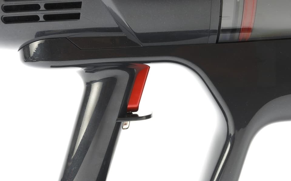 Моторный блок, или основной корпус, пылесоса Evolution Smart Clean VCF2712M оснащен ручкой пистолетного типа. При держании ручки указательный палец ложится на курок, которым запускается пылесос, остальные пальцы располагаются ниже специального выступа и удерживают саму ручку пылесоса.