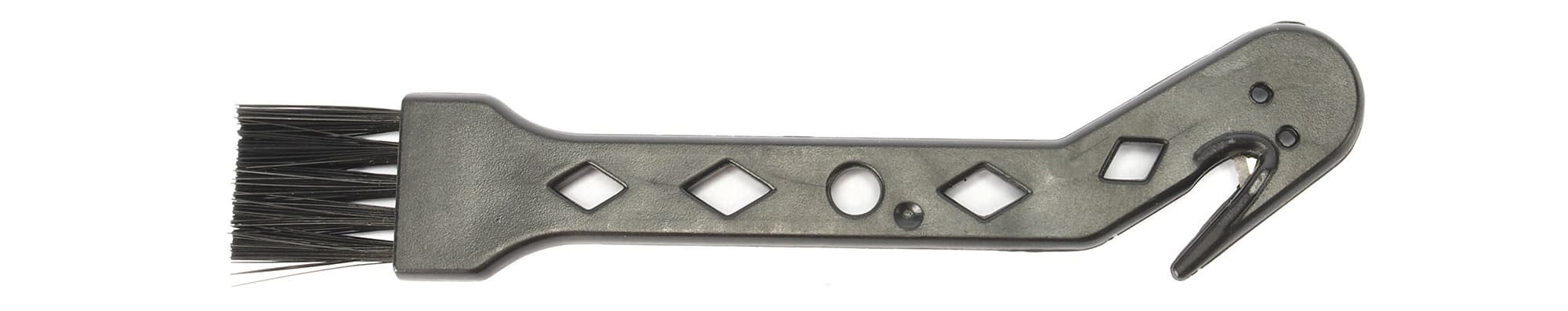 Учитывая, что обе электрощетки снабжены вращающимися валиками, нас порадовало наличие в комплекте к пылесосу скребка для очистки. Очевидно, что вращающиеся валики в щетках обречены на наматывание на них волос и нитей, так что заточенная маленькая металлическая поверхность в крючкообразном конце скребка — настоящее спасение в этом случае. Этот же крючок на конце, кстати, послужит нам для удобного извлечения фильтров из пылесборника. Небольшая щеточка с другого конца скребка пригодится для очистки поверхности фильтра от пыли.