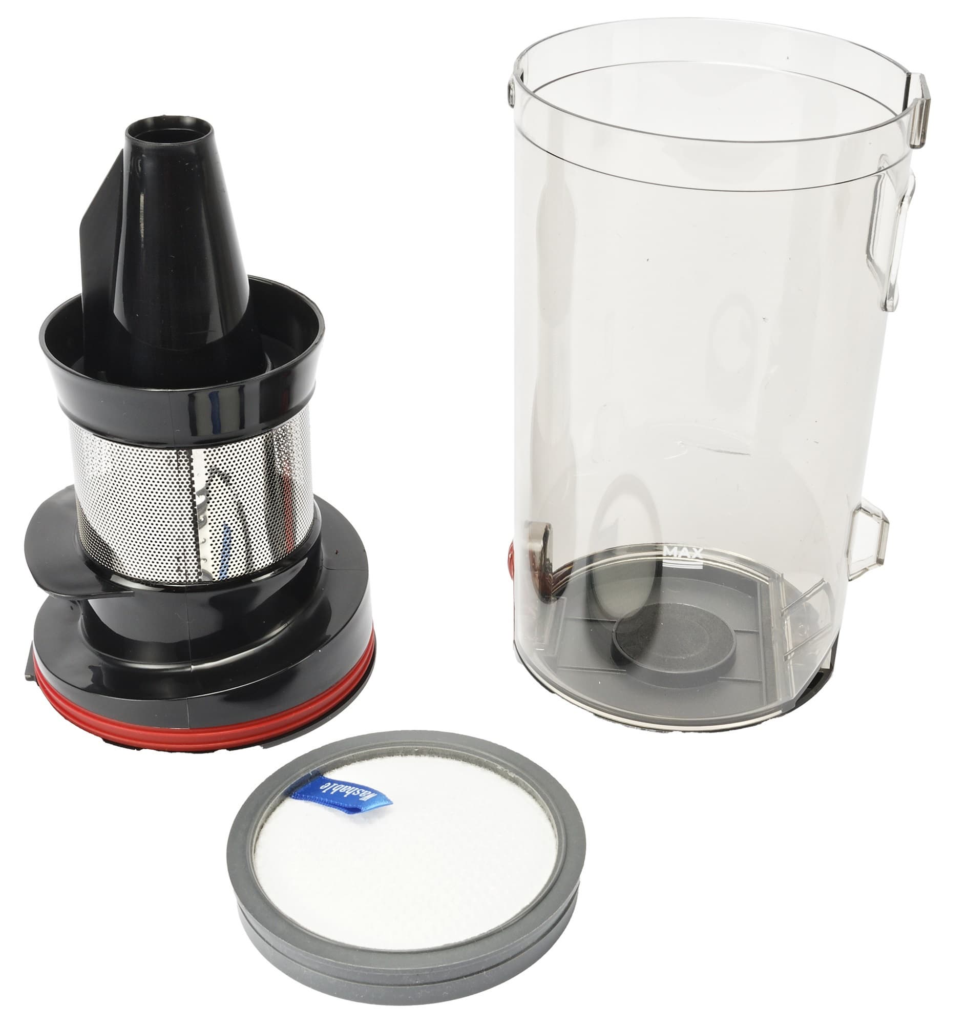 Внутри пылесборника установлены фильтры. Это циклонный фильтр, расположенный по центру пылесборника, а также хлопковый фильтр, который устанавливается в месте крепления пылесборника к мотору. Они легко вынимаются для очистки и также просто устанавливаются обратно.