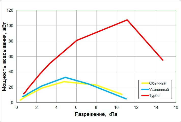 Зависимость мощности всасывания от создаваемого разрежения приведена на графиках ниже: