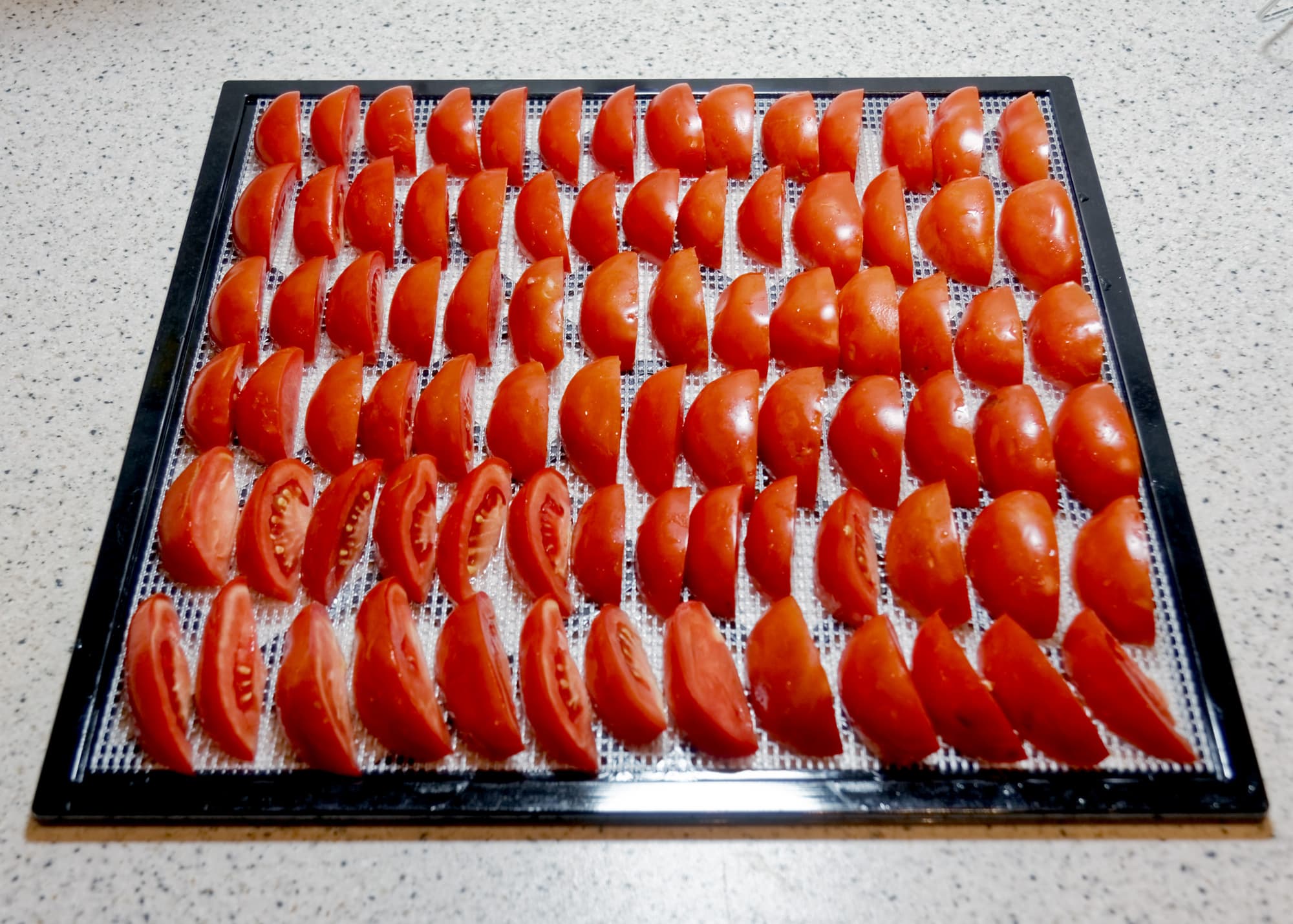 Для этого теста мы взяли два сорта томатов: обычные томаты-«сливы» и томаты-черри. Подготовка к дегидрации оказалась проста: черри оказалось достаточно разрезать пополам.
