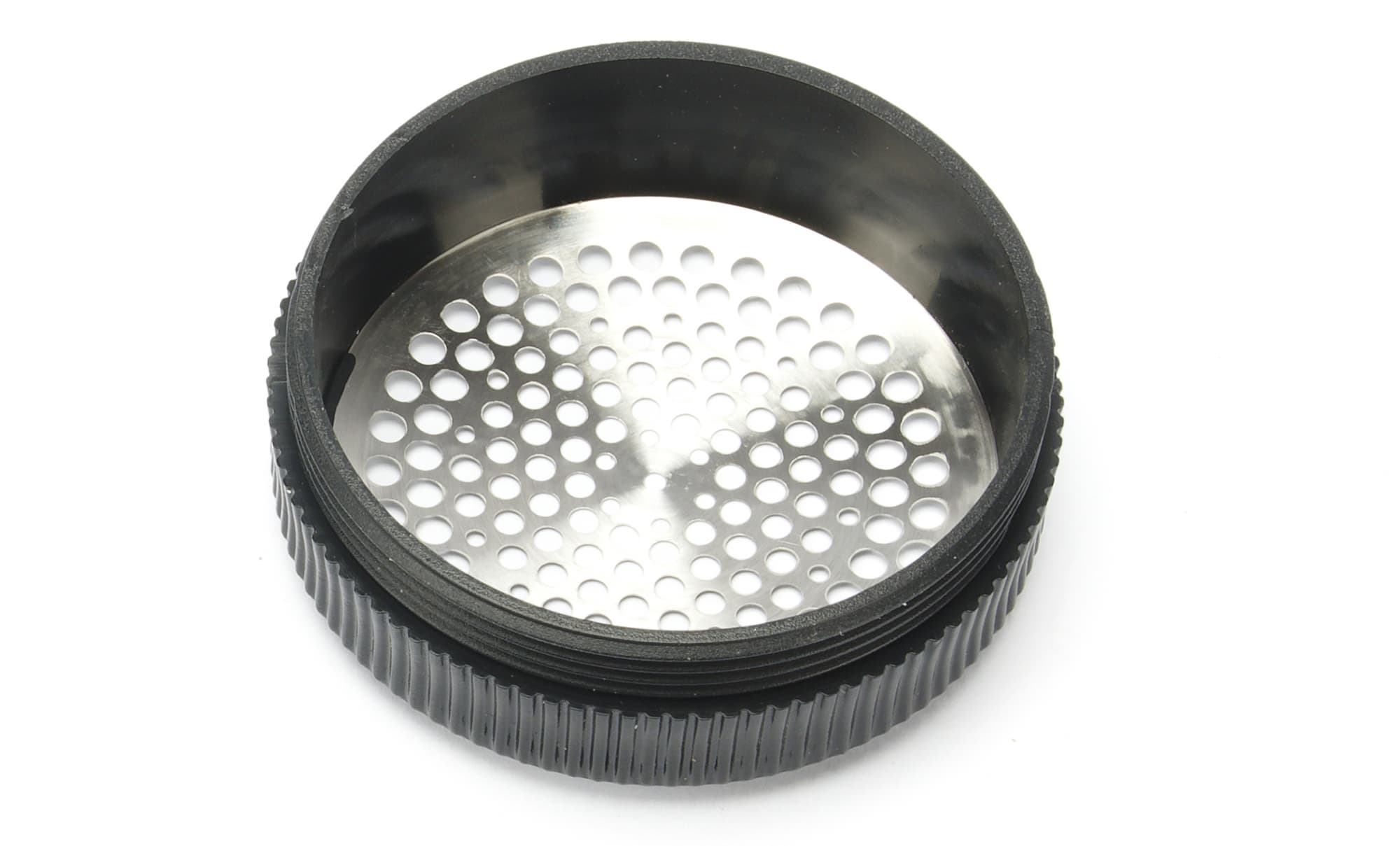 Металлическая защитная решетка имеет пластиковое ребристое основание, благодаря которому закручивается на корпусе по резьбе.