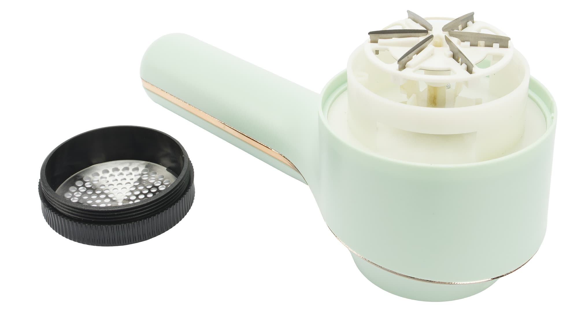 Под ней мы наблюдаем съемный блок ножей, состоящий из 6 острых лезвий, закрепленных на пластиковом белом основании. Основание имеет множество отверстий для выхода срезанных частиц ткани вниз.