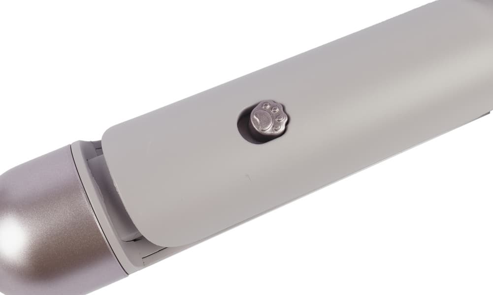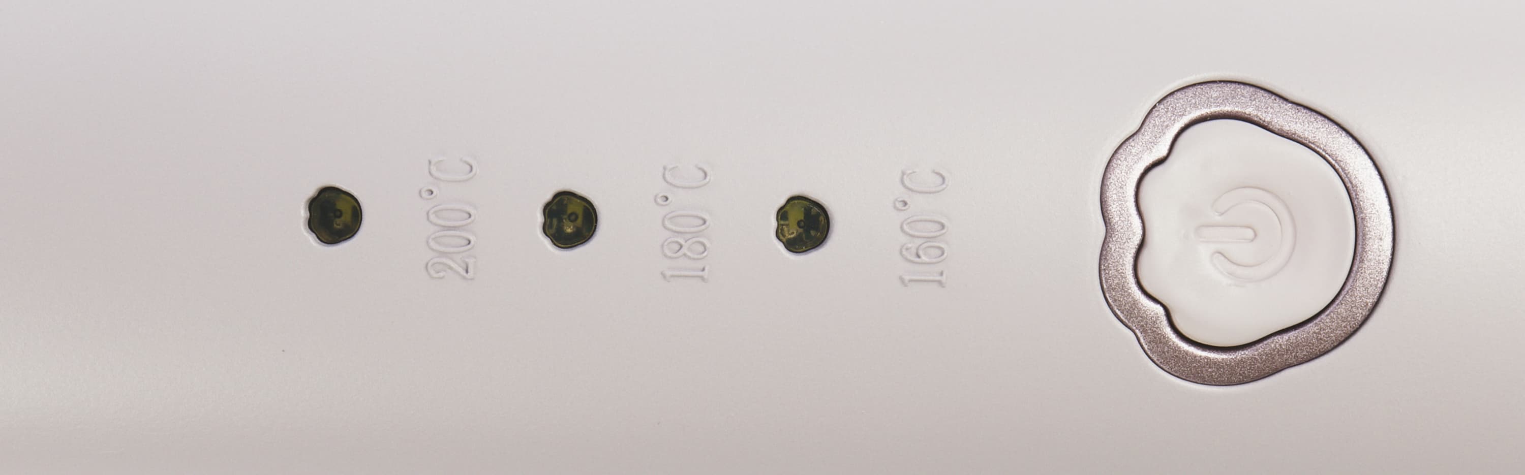 На лицевой части кнопка и световой индикатор включения/выключения работы, над ней тремя уровнями индикаторы температурных режимов: 160 °C, 180 °C, 200 °C. С обратной стороны — умилительная лапка — кнопка блокировки щипцов. Ей удобно фиксировать прибор на время бездействия, пока расчесываешь пряди или закрепляешь локоны заколками.