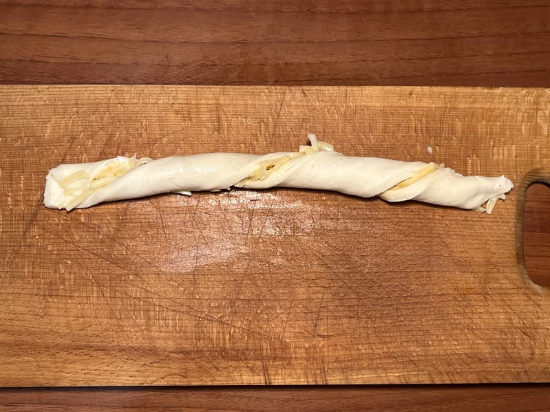 Каждую полосу хорошенько раскатали, смазали желтком и разместили сверху тертый сыр.