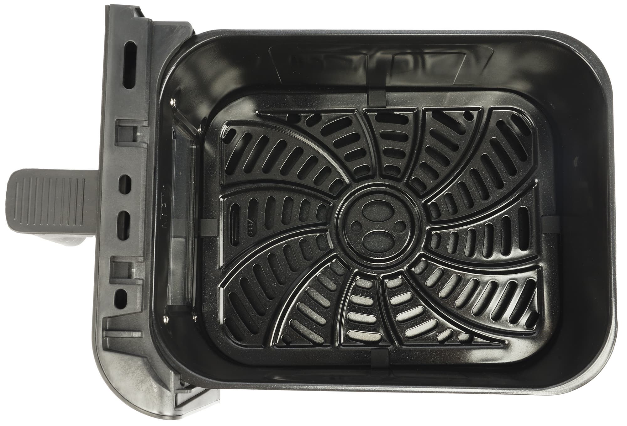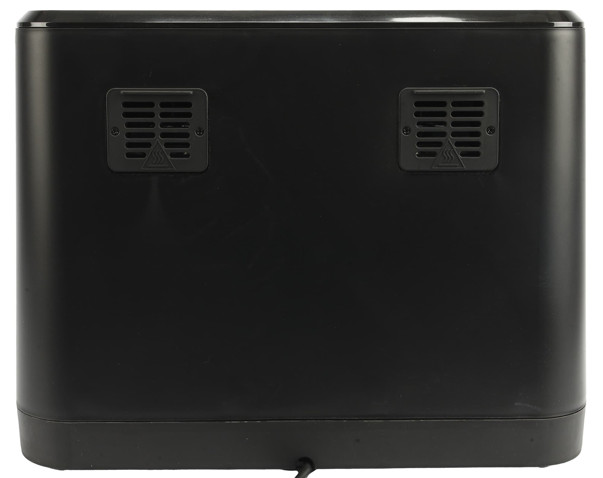 Так как данная модель имеет два вместительных лотка по 5,5 л, габариты у нее достаточно внушительные, но вытянутый вверх корпус позволяет разместить прибор на рабочей поверхности достаточно компактно — аэрогриль занимает места не больше, чем мультиварка или небольшая микроволновка. Две чаши дают возможность параллельно готовить сразу два разных блюда, поэтому аэрогриль отлично подойдет для большой семьи.