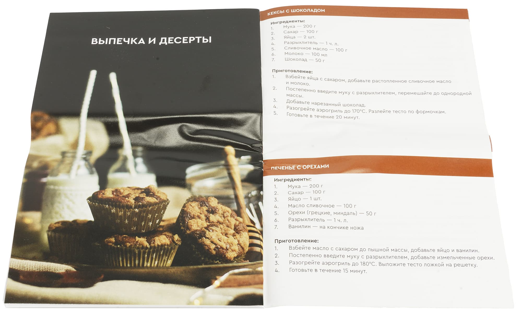 Дополнительно производитель положил к прибору книгу рецептов именно для аэрогриля. В ней 33 страницы и 55 рецептов как сытных, так и сладких блюд.