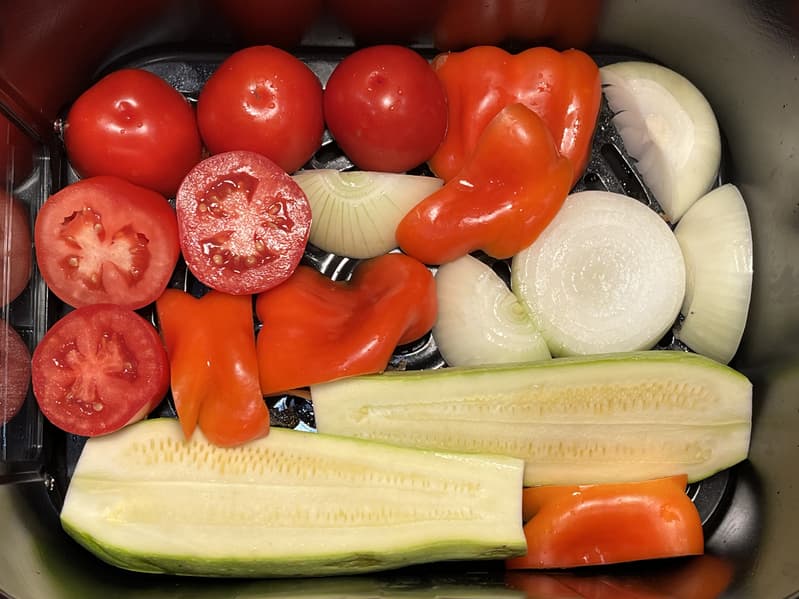 А в соседний лоток поместили овощи — сладкий перец, репчатый лук, томаты и кабачок.