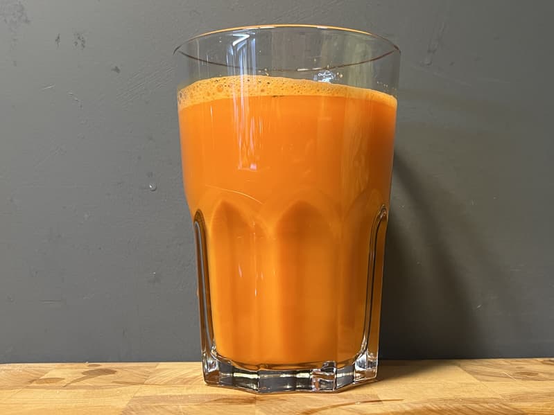 Наша морковь была не очень сочной, но тот сок, что удалось добыть, замечательно пах, получился ярким, насыщенным по вкусу и аромату, с небольшим количеством светло-оранжевой пенки.