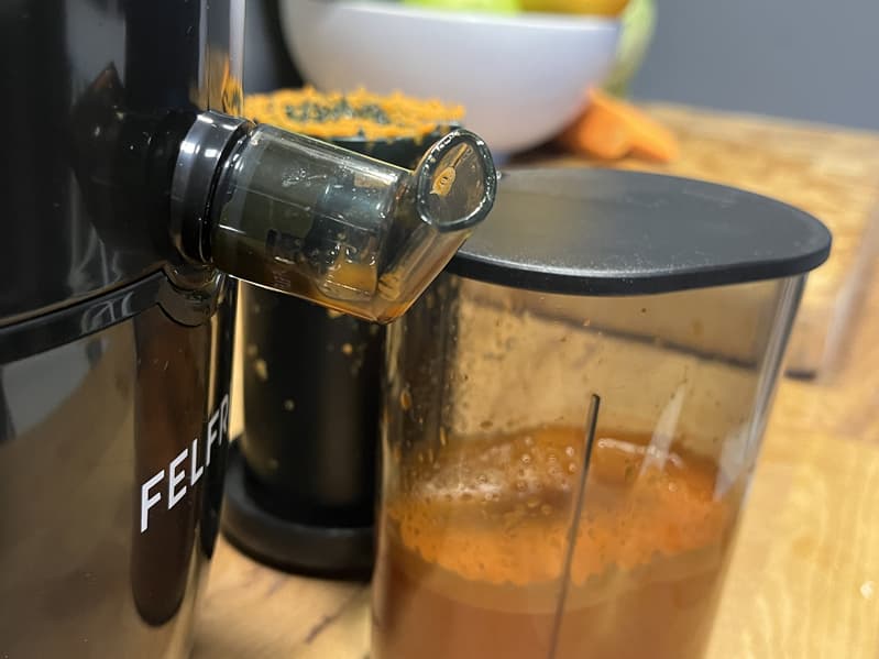 Контейнер для жмыха наполняется достаточно быстро. При обработке килограмма моркови нам пришлось делать паузу, чтобы вынимать накопившиеся отходы, освобождая место для следующей порции. Поэтому при обработке большого количество продуктов могут возникнуть сложности.