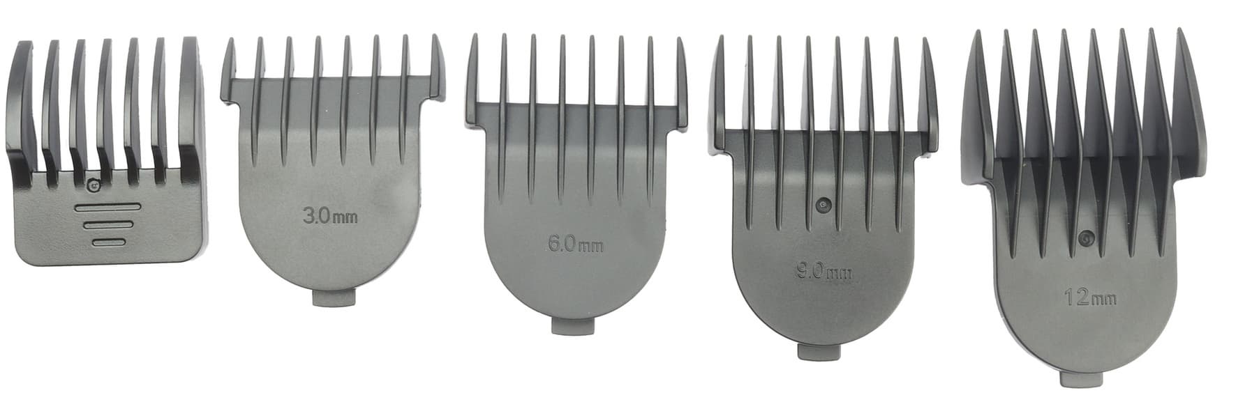 Все они похожи друг на друга. Чтобы избежать путаницы, на каждом из них (кроме крайнего левого гребня, предназначенного для работы с прецизионным триммером) написано, на какую длину волос он рассчитан.
