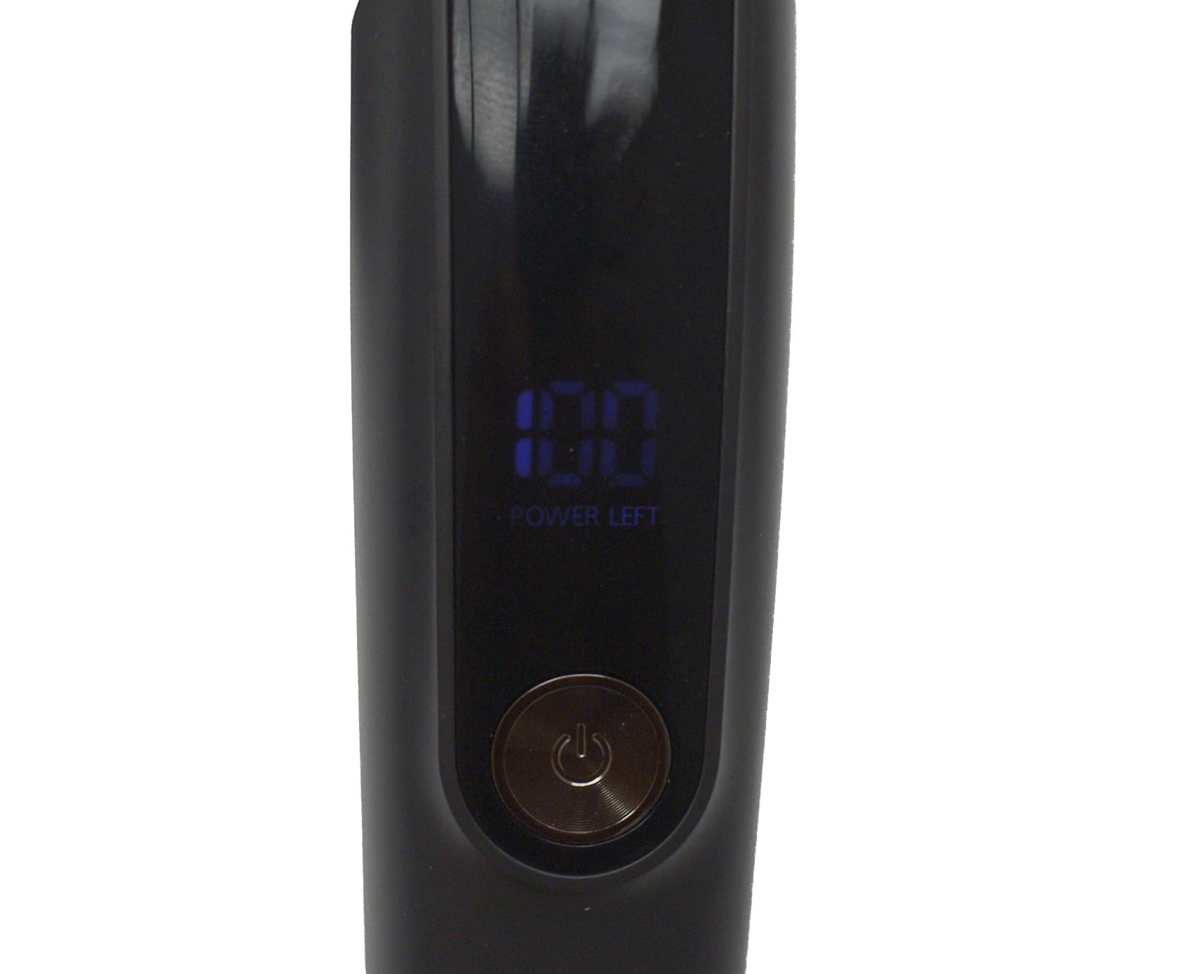Над кнопкой присутствует светодиодный индикатор, который никак не выделяется в выключенном состоянии. Во время работы прибора индикатор показывает оставшийся уровень заряда аккумулятора (в процентах). Рядом с ним расположен индикатор подключения зарядного устройства, который загорается когда триммер стоит на зарядке.