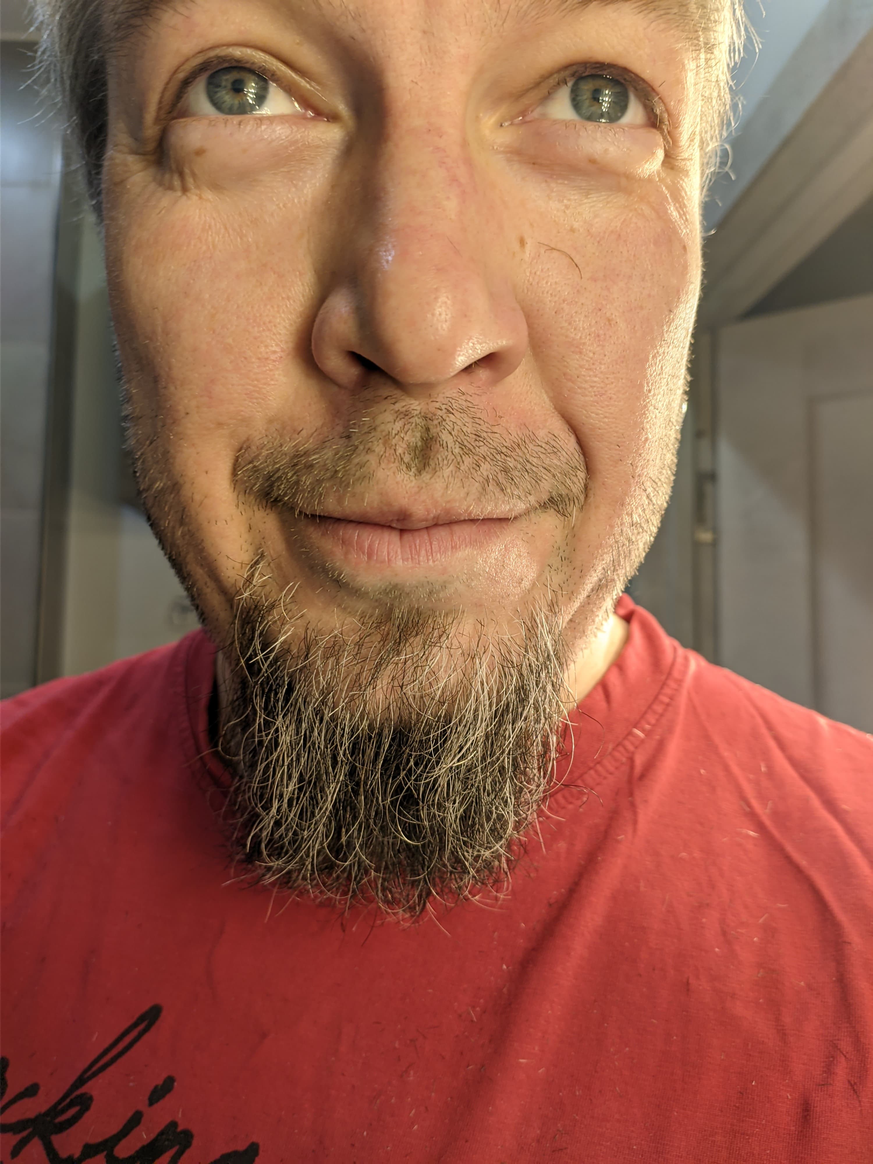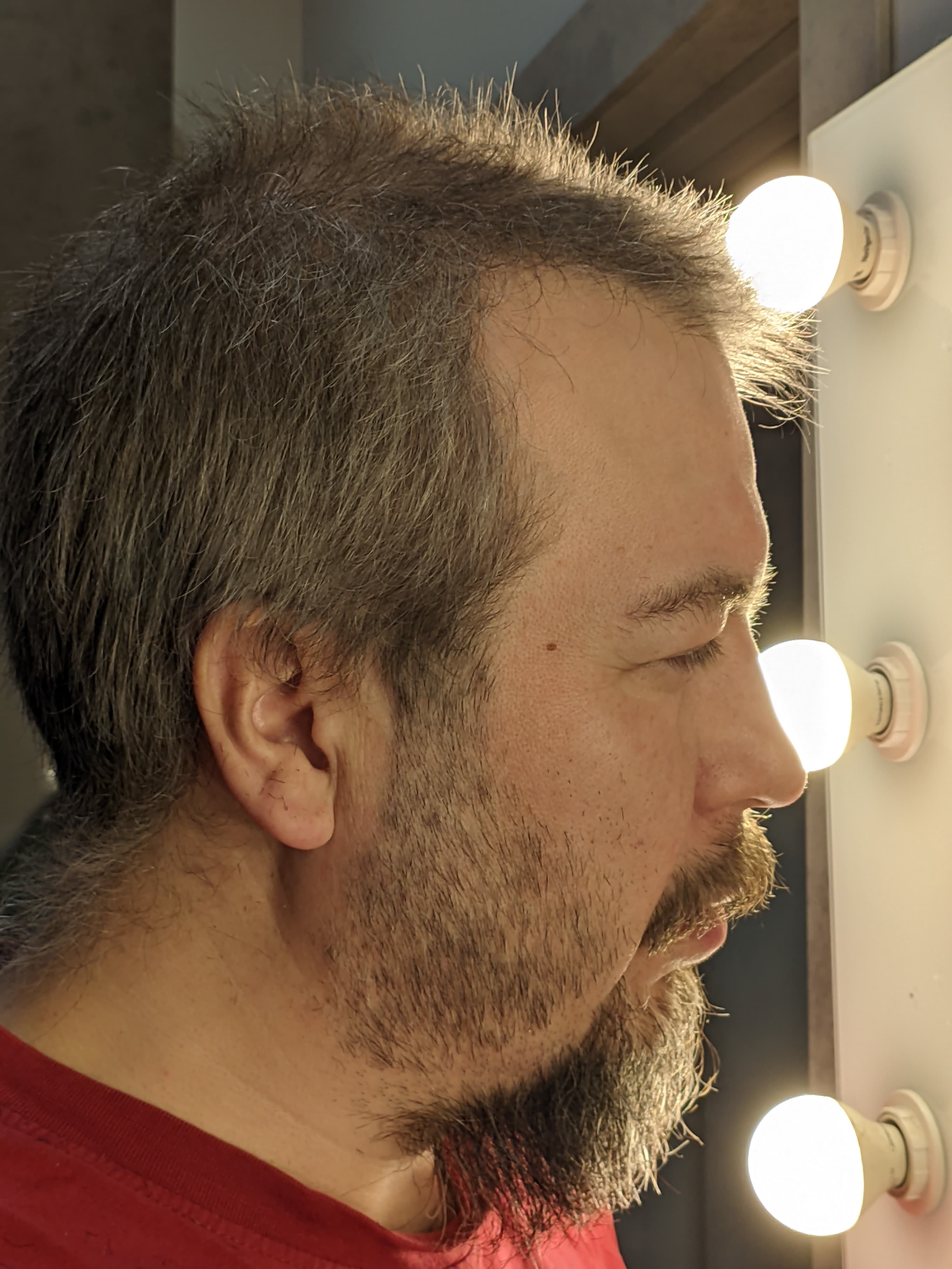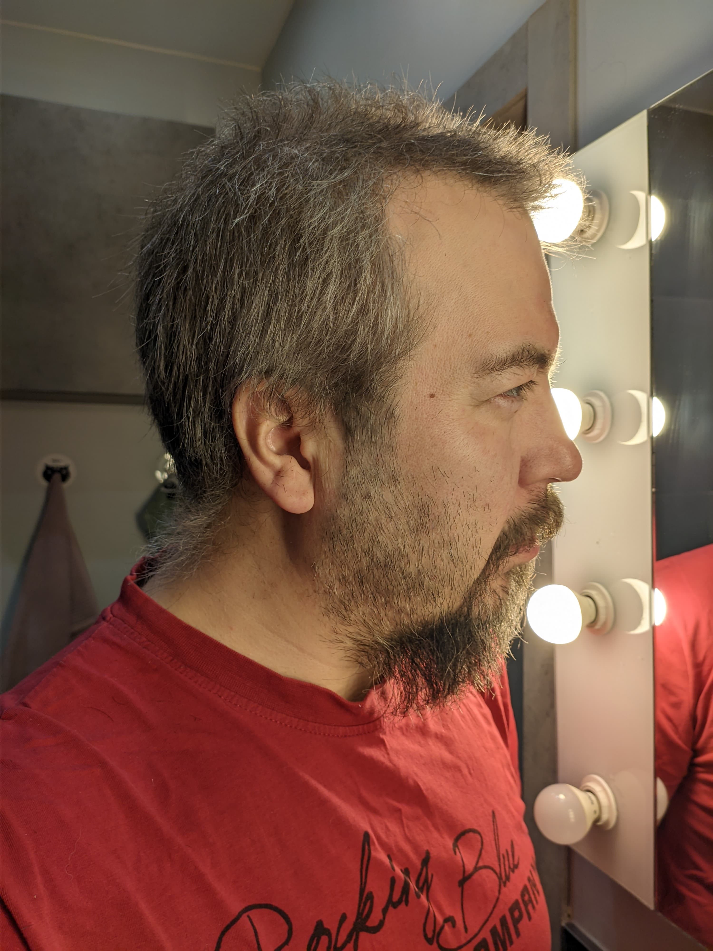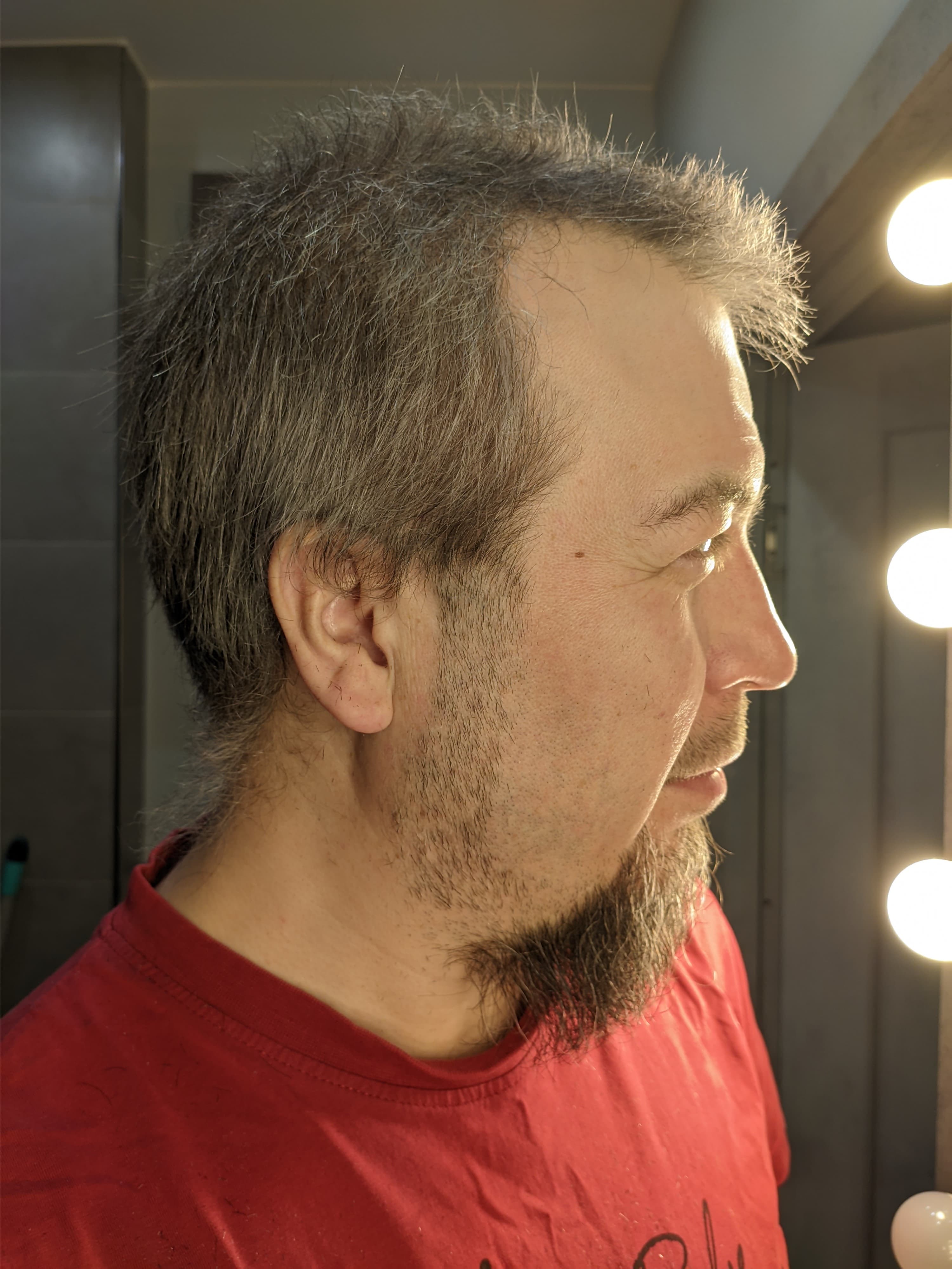 Результат оказался существенно лучше, но не идеальный. Основная часть волос на щеках оказалась пострижена почти как надо. А вот зоны, прилегающие к шее, оказались пострижены неровно и неаккуратно. Исправить ситуацию не удалось даже после нескольких проходов.