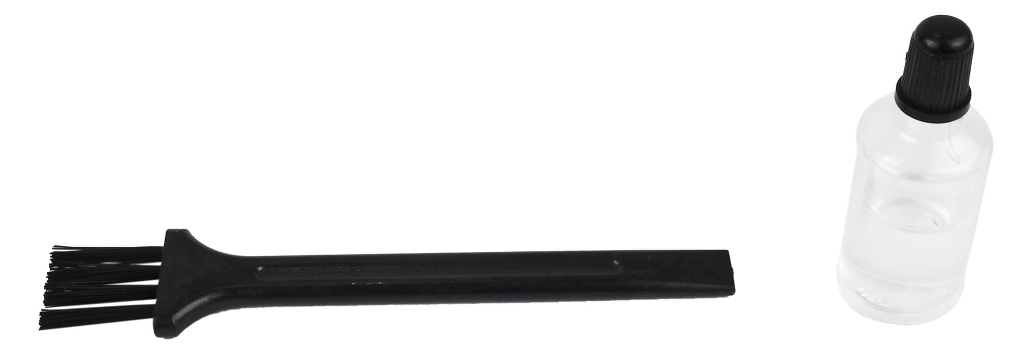 Бутылочка с маслом для смазки, пластиковая расческа и миниатюрная пластиковая щеточка для очистки.