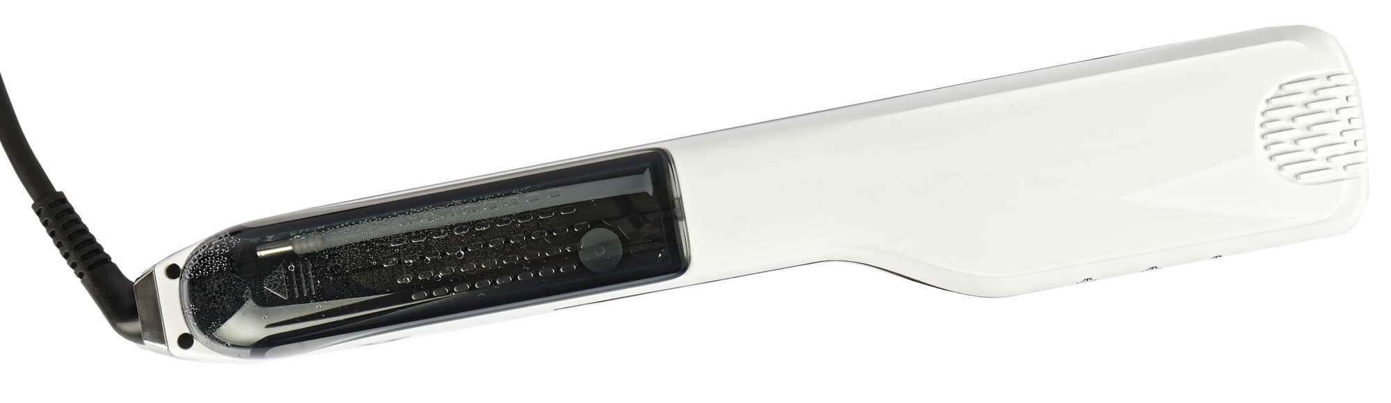Мы проводили тестирование на густых вьющихся волосах длиной до лопаток (40 см). При нагреве панелей до 150 °C с использованием пара процесс занял около 25 минут. Для идеального выпрямления требовалось протягивать каждую прядь по 2-3 раза. Волосы распрямлялись и под воздействием пара моментально становились мягкими и более послушными. Маленькая насадка-расческа оказалась весьма эффективной, с ее помощью удалось пригладить отдельные обычно торчащие в разные стороны мелкие волоски и вообще убрать излишнюю пушистость. При максимальном нагреве та же процедура заняла гораздо меньше времени, всего минут 15. Каждой пряди было достаточно всего одного протягивания. Полного резервуара нам хватило ровно на две укладки.