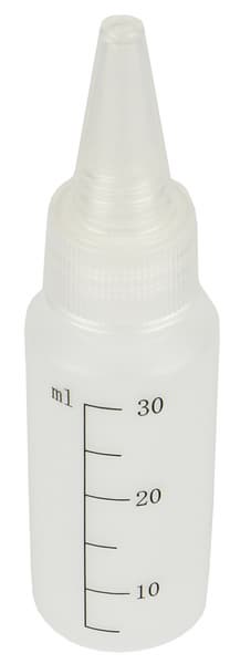 Для удобства залива жидкости в комплекте предусмотрена бутылочка с конусообразным наконечником. До верхней отметки в емкость помещается ровно 30 мл, что соответствует вместимости резервуара.
