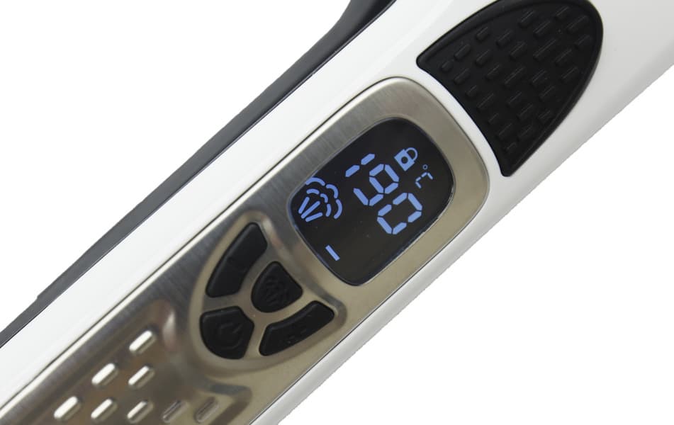 Элементы управления в виде механических кнопок и дисплея располагаются на верхней панели корпуса. Над дисплеем находится рифленая резиновая вставка, приходящаяся ровно под большой палец. Благодаря ей, при сильном нагреве корпуса не приходится касаться горячего пластика и прибор из рук не выскальзывает.