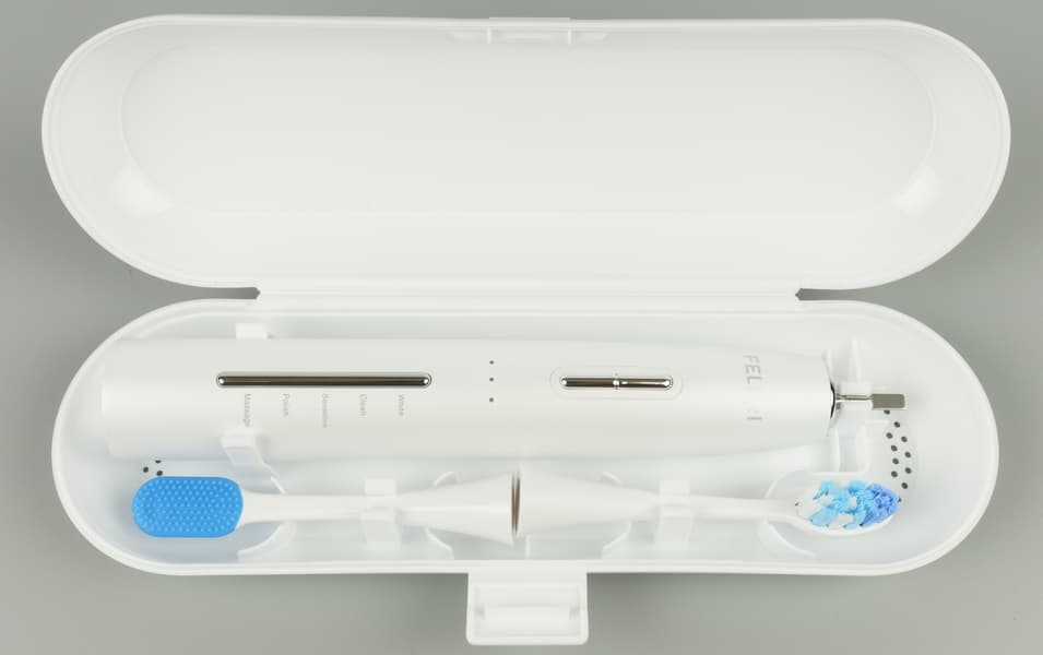 Чехол-кейс сделан из белого матового пластика. Внутри поместится сама щетка, а также две насадки, которые крепятся с помощью миниатюрных защелок.