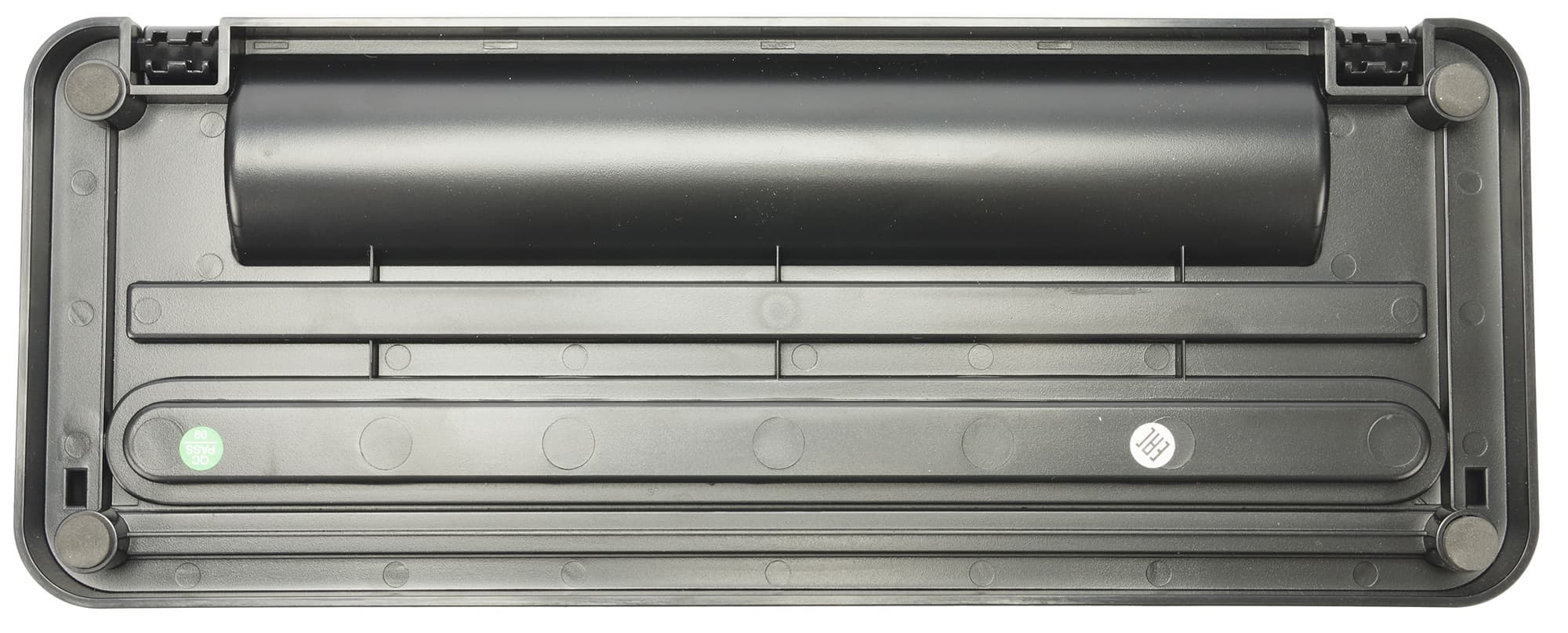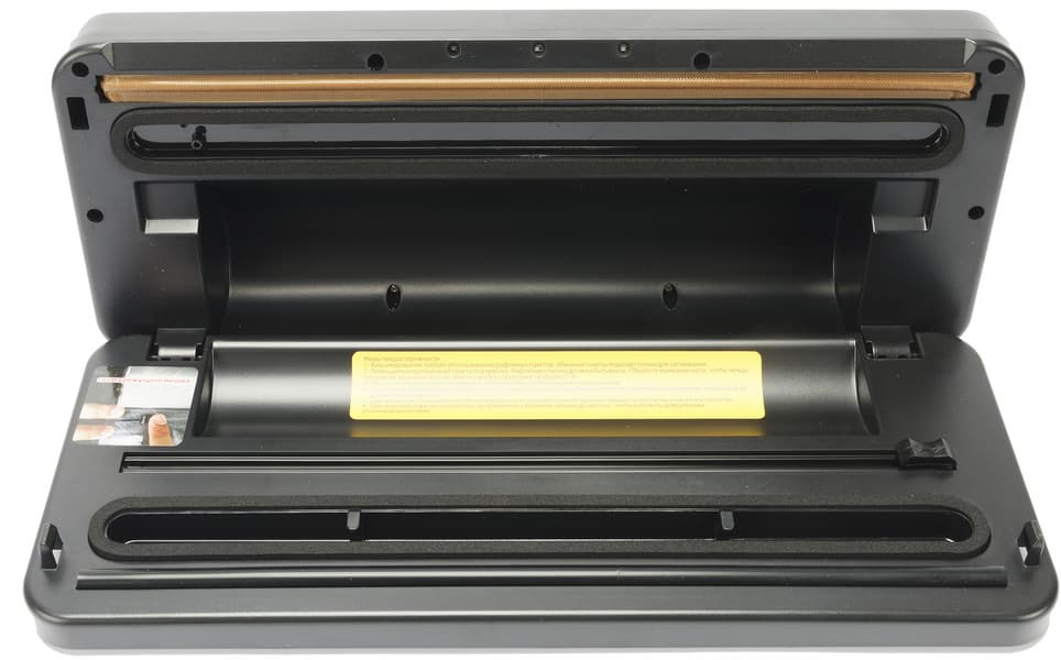 Открыв крышку, мы видим: два вспененных уплотнителя снизу и сверху, поддон для сбора жидкости и отверстие для откачивания воздуха, ближе к внешнему краю — металлический нагревательный элемент с тефлоновым покрытием, а на крышке ровно над ним — прижимной валик из термостойкого материала, похожего на резину.