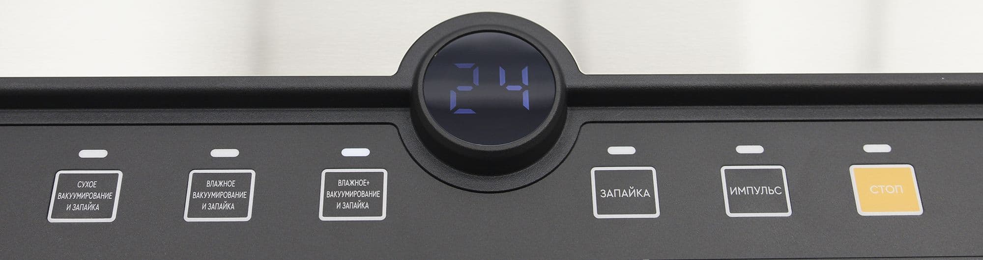 На панели управления вакууматора расположены шесть кнопок, шесть световых индикаторов и один цифровой таймер, показывающий обратный отсчет времени работы. Управление интуитивное: подписи на кнопках и цветовая индикация делают использование прибора понятным даже без предварительного изучения инструкции.
