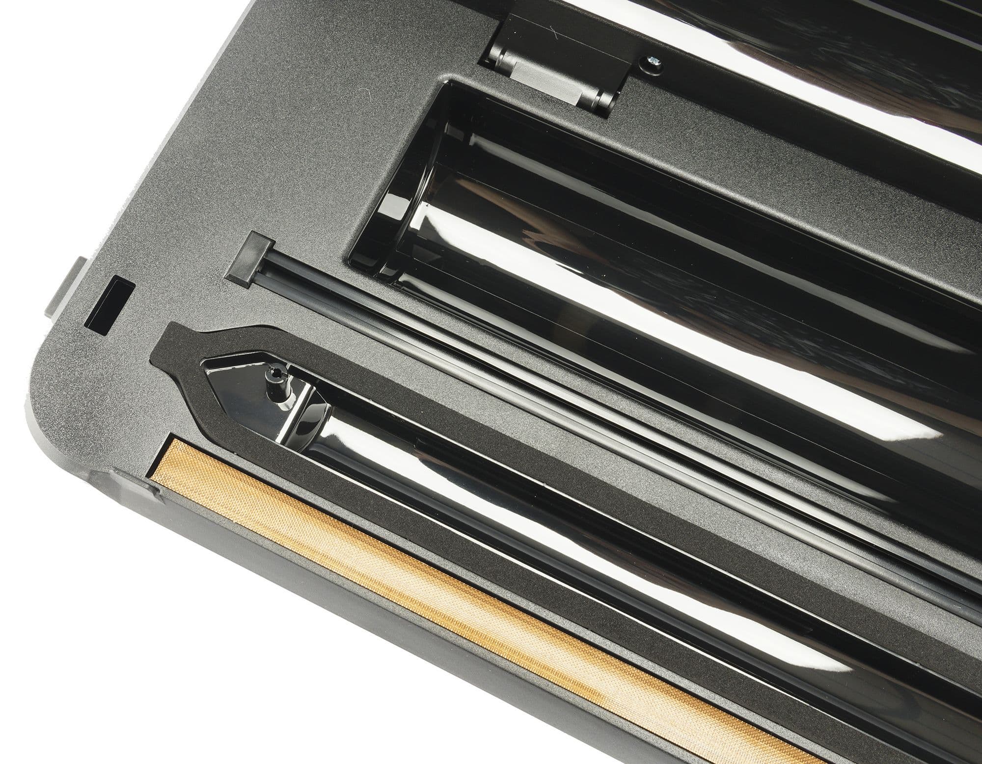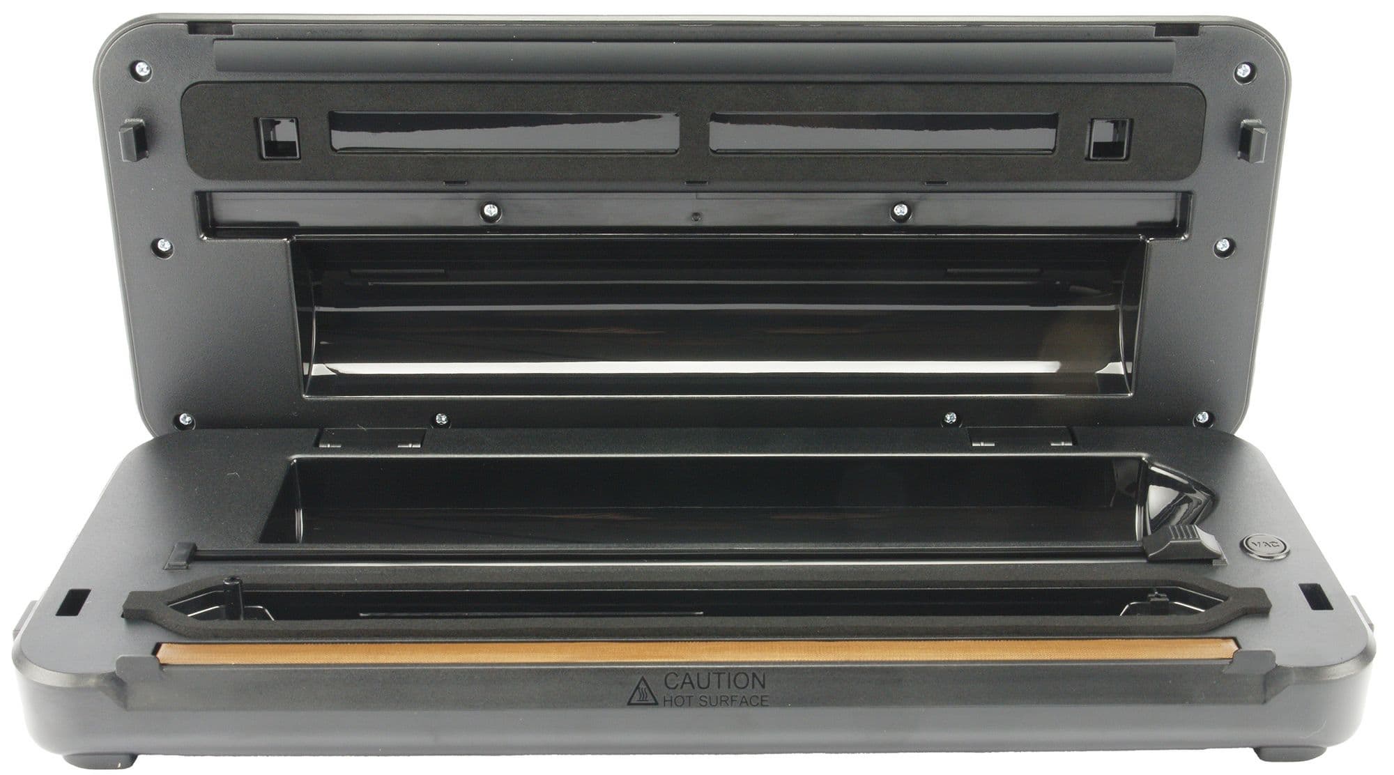 В нижней, основной части корпуса располагается лента запаивания, на фото она видна внизу и выделяется светло-коричневым оттенком. Именно она отвечает за герметичную запайку пакета в сочетании с силиконовой полосой. Рядом находится уплотнительная прокладка, обеспечивающая плотное прилегание крышки во время откачки воздуха.