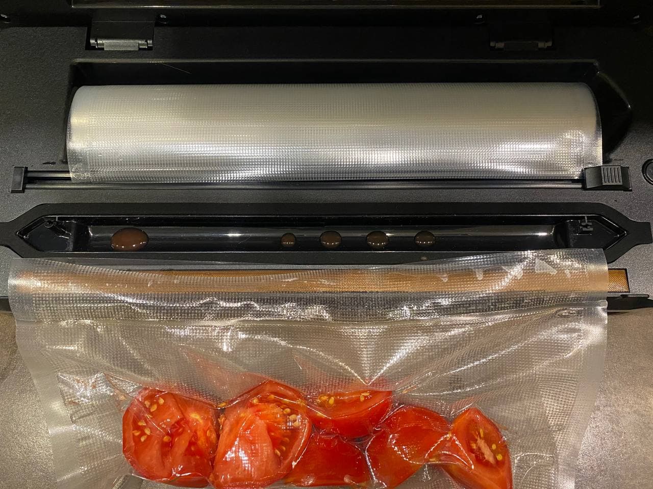 Запустили режим «влажное вакуумирование и запайка». Процесс прошел быстро, но часть помидоров немного поджалась, и немного сока попало в вакуумную камеру.
