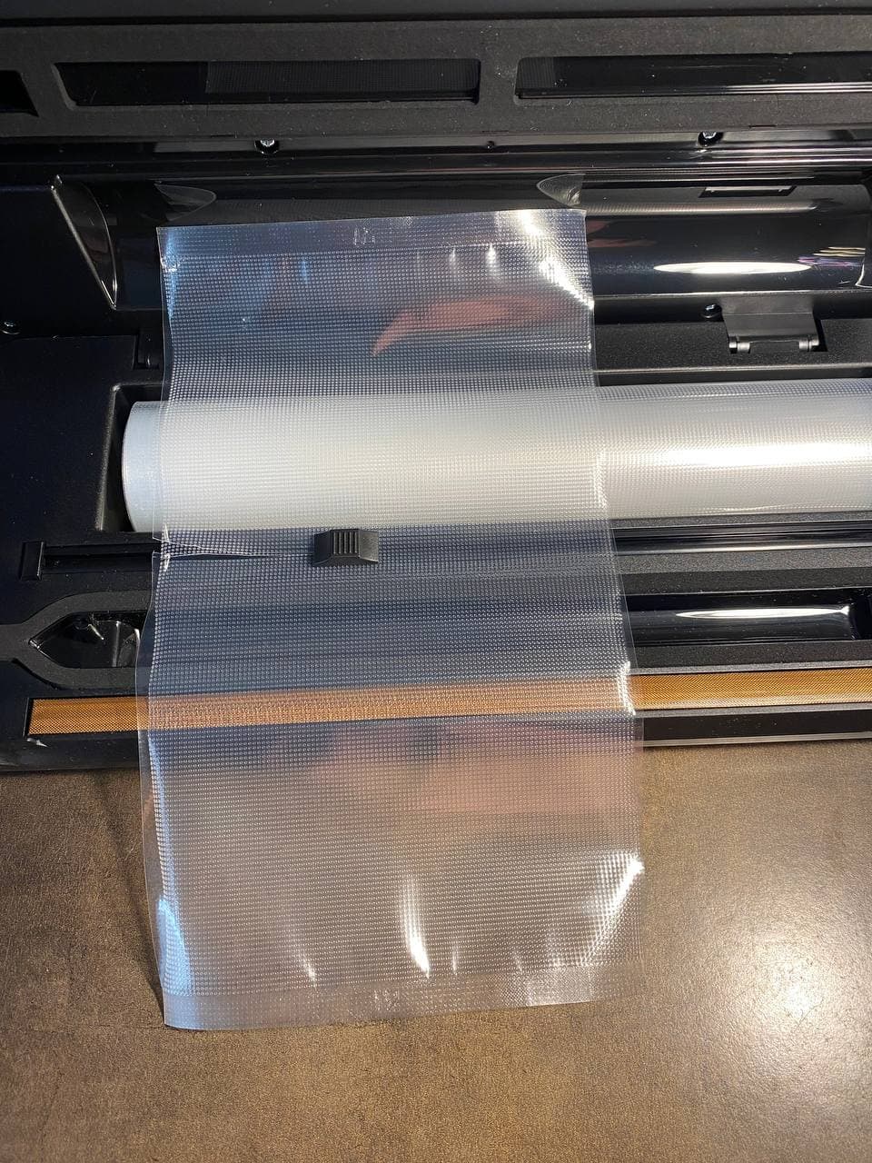 В процессе эксплуатации прибора мы обнаружили для себя полезный лайфхак: можно самостоятельно изготавливать пакеты нужного размера из рулона с пленкой. Всё просто: с помощью встроенного резака отрезаем кусок нужной длины (естественно, ширина пакета будет ограничена шириной рулона), запаиваем один край — и пакет готов к использованию.