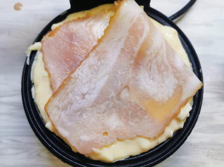 У нас получилась достаточно жидкая масса, которая при выкладке на противень вальяжно растеклась во все стороны. От себя мы добавили в рецепт кусочек бекона, который просто положили сверху на тесто.