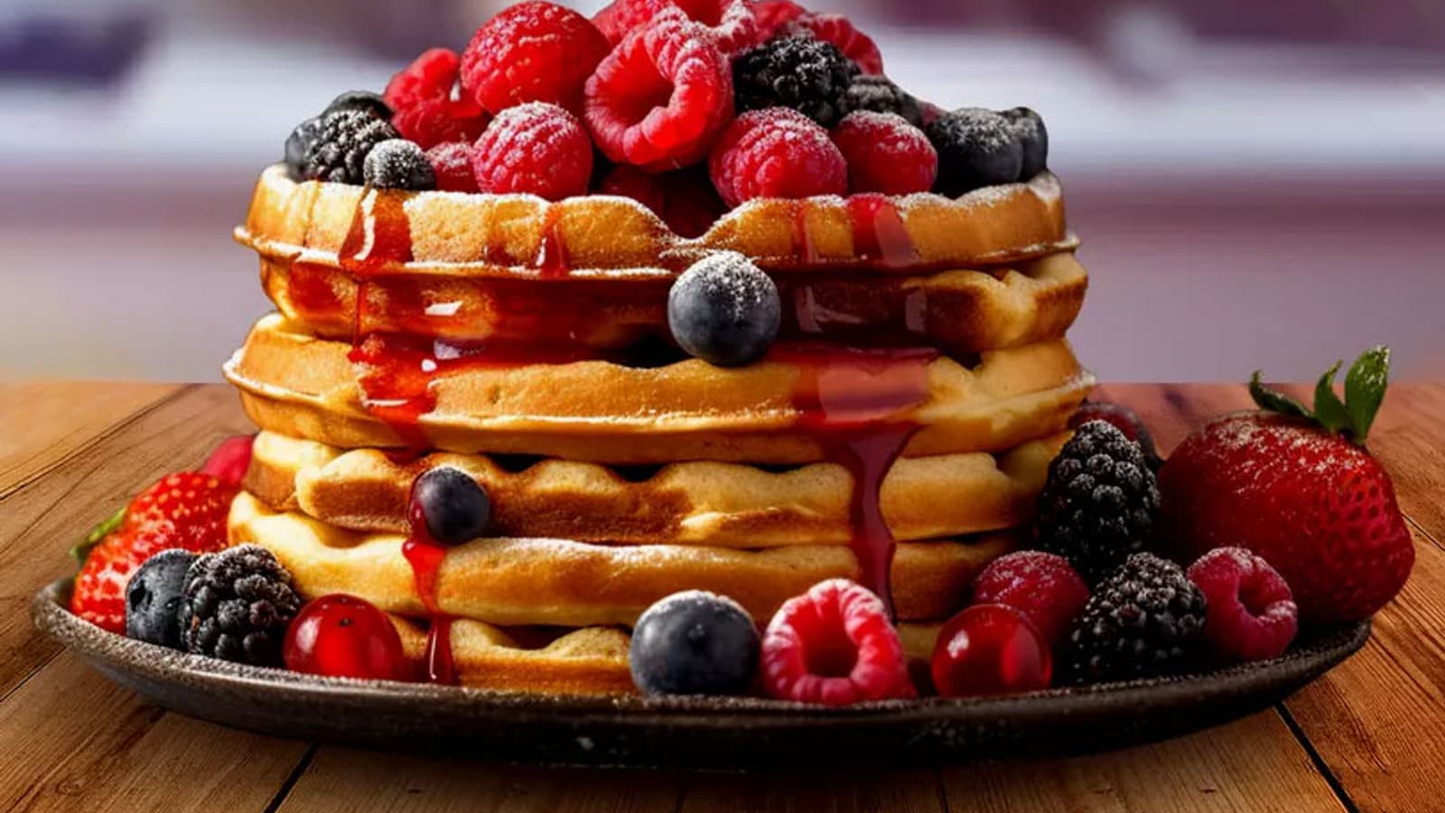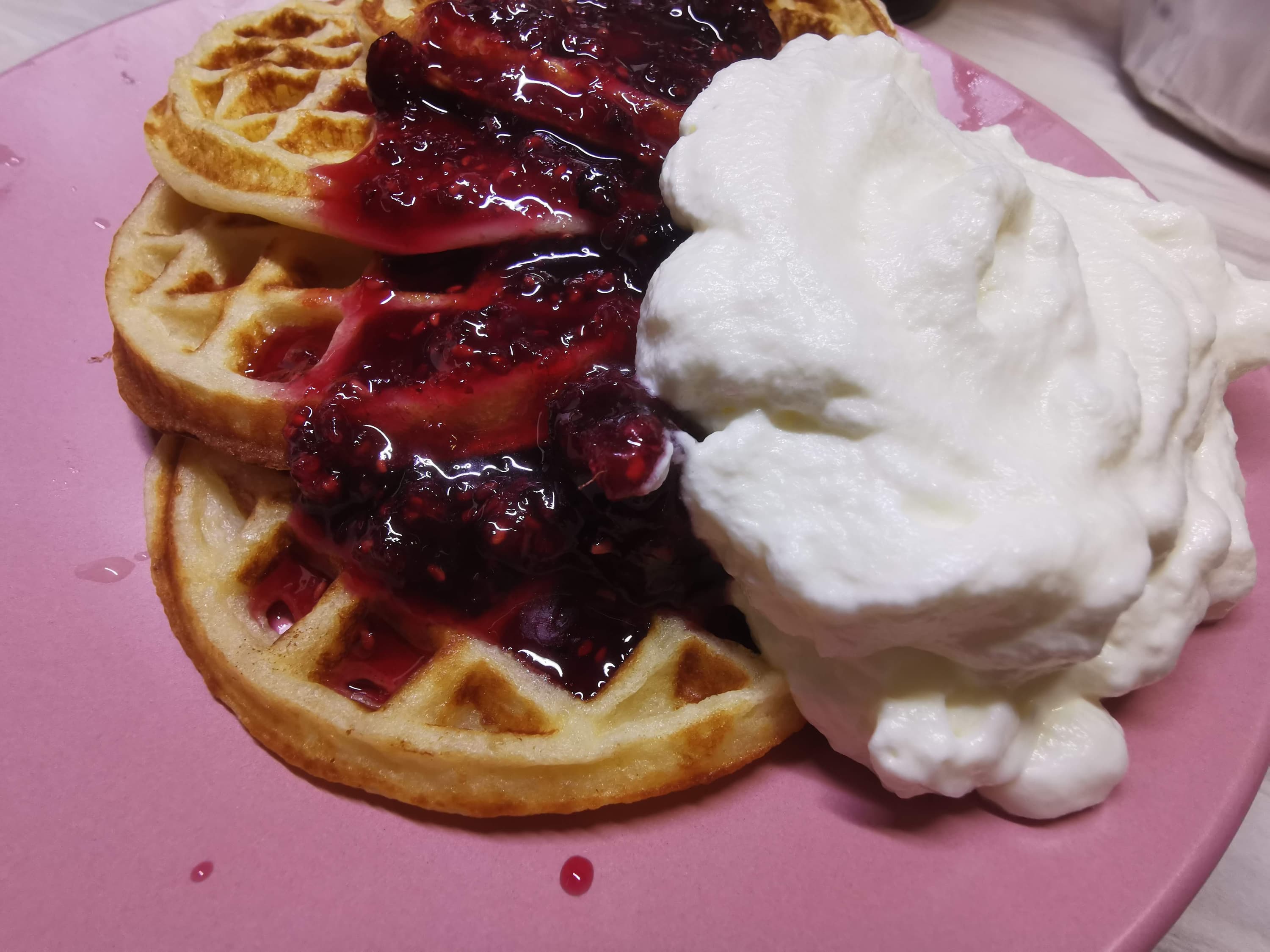 Для подачи на стол мы украсили вафли малиновым вареньем и взбитыми сливками. Получился идеальный завтрак за очень малое время на кухне.