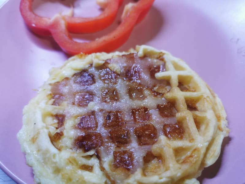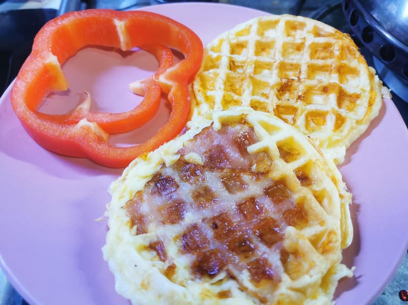 Горячие вафли при надломе тянутся благодаря большому количеству сыра, а бекон отлично дополняет собой это блюдо, поэтому для подачи мы просто украсили их свежим красным перцем. На две вафли у нас ушло 8 минут.