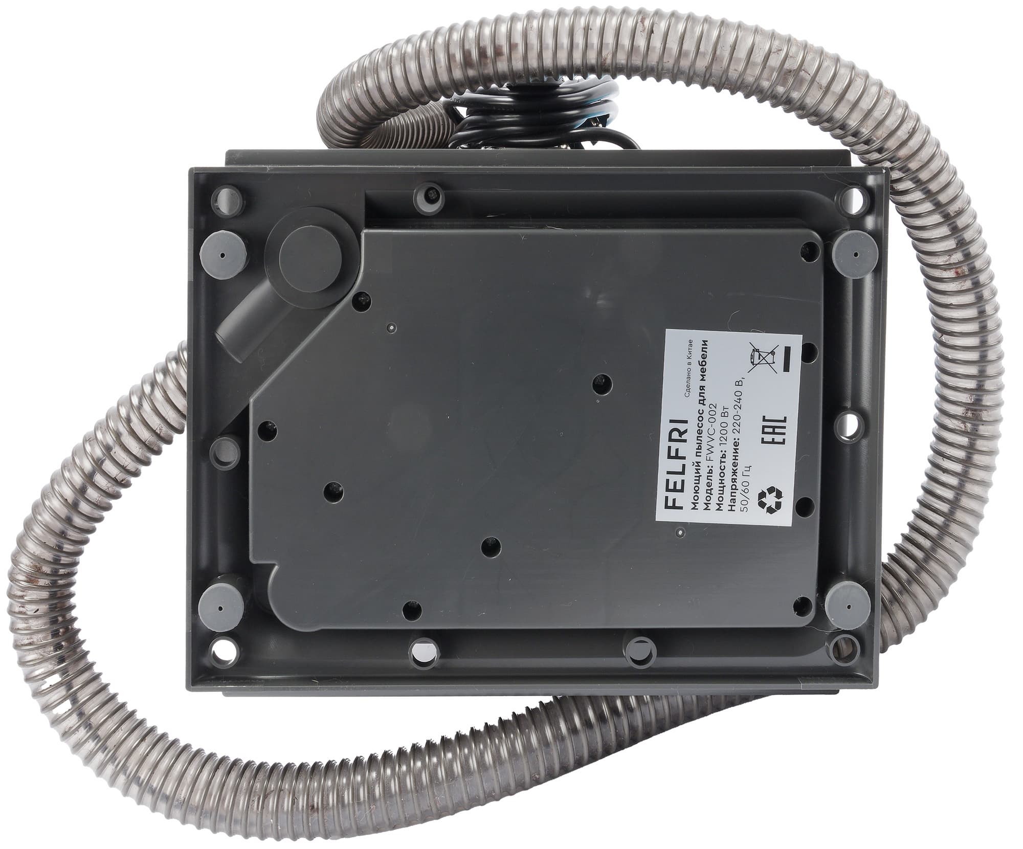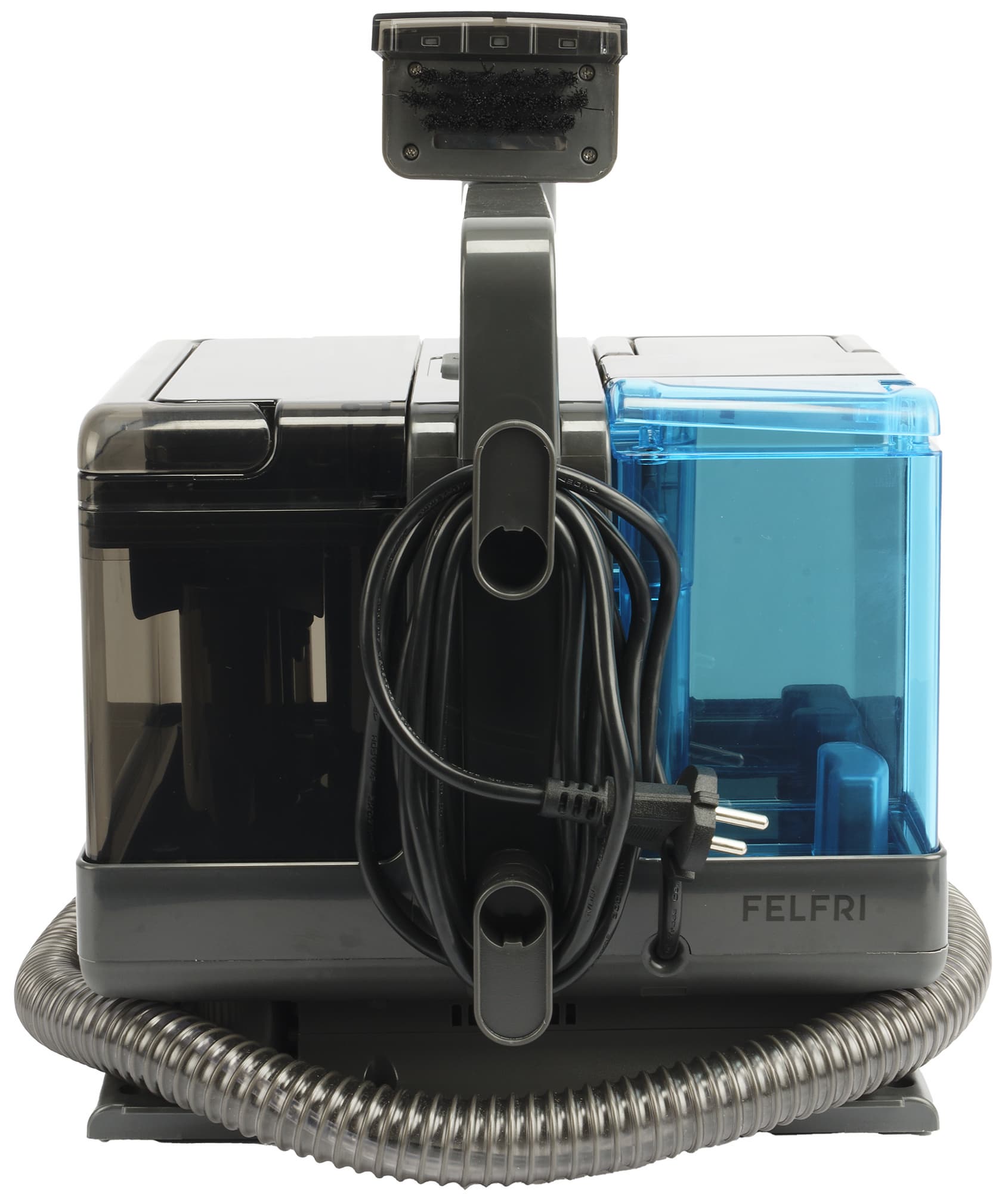 Моющий пылесос Felfri FWVC-002 в собранном виде представляет собой небольшой параллелепипед со скругленным углами. Он состоит из пластикового корпуса-базы серого цвета с мотором, двух резервуаров из затемненного пластика для чистой и грязной воды, из голубого пластика — для моющего средства, и серого пластикового гофрированного шланга.