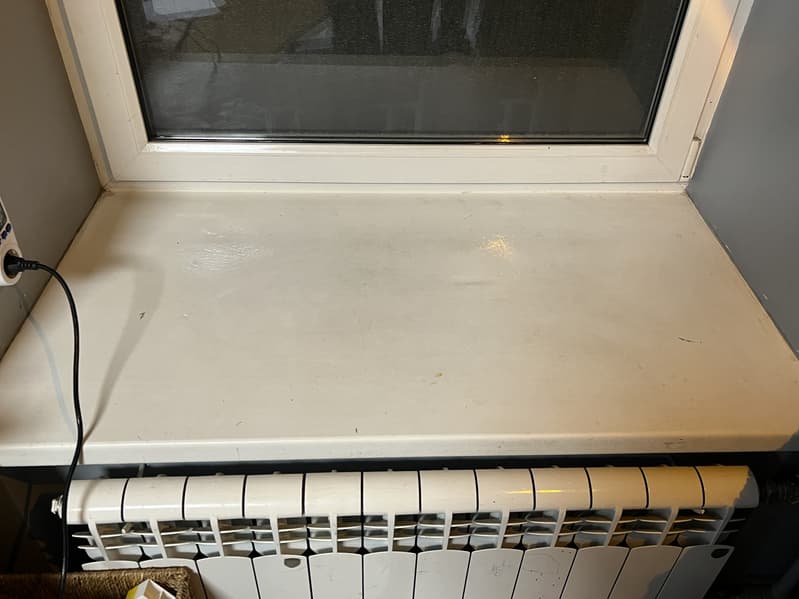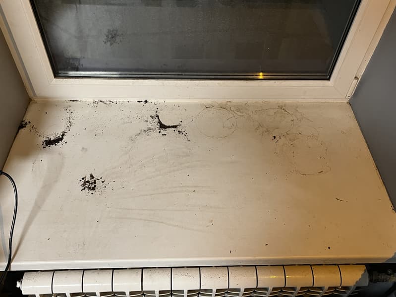 Следующей нашей целью стал большой пластиковый подоконник, на котором завелось множество следов от горшков с растениями и некоторое количество земли из них же.