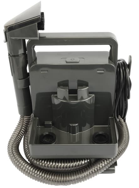 На дне емкости для грязной воды расположены два отверстия, через которые отработанная жидкость засасывается в контейнер. Отверстия имеют углубление внутрь корпуса и выглядят как две полые трубки. Такая конструкция позволяет грязной воде попадать в контейнер не проливаться при его съеме с базы.