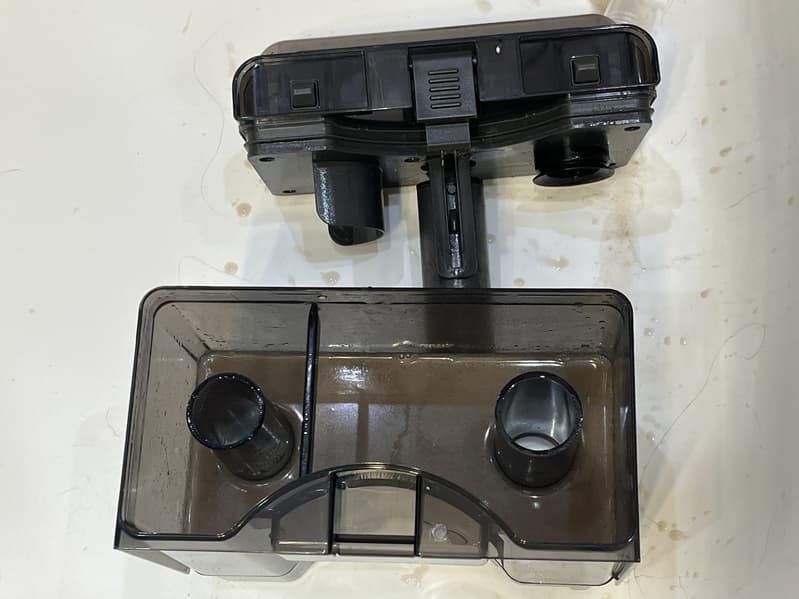 Контейнеры имеют сходную форму и конструкцию, но разный объем. Пластиковая емкость для чистящего средства голубого цвета имеет заявленный объем 600 мл, а серая полупрозрачная емкость для чистой воды — 1200 мл. У каждого бака сверху имеется удобная складная ручка для снятия с корпуса прибора и переноски.