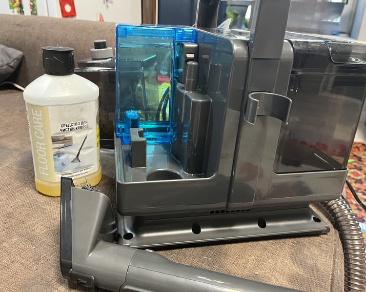 По итогу использования моющего пылесоса для очистки дивана можем сказать, что нам понравилось всё, кроме коротковатого шланга, излишнего поступления чистой воды, что можно регулировать с помощью постоянного отключения/включения подачи, и скудного поступления моющего средства, которое, к сожалению, как-то отрегулировать нельзя. И также отметим, что диван после влажной чистки остается достаточно намокшим, высушить его при помощи сухой уборки не получится, поскольку пылесос не способен «всосать» всю ту влагу, что осталась в ткани.
